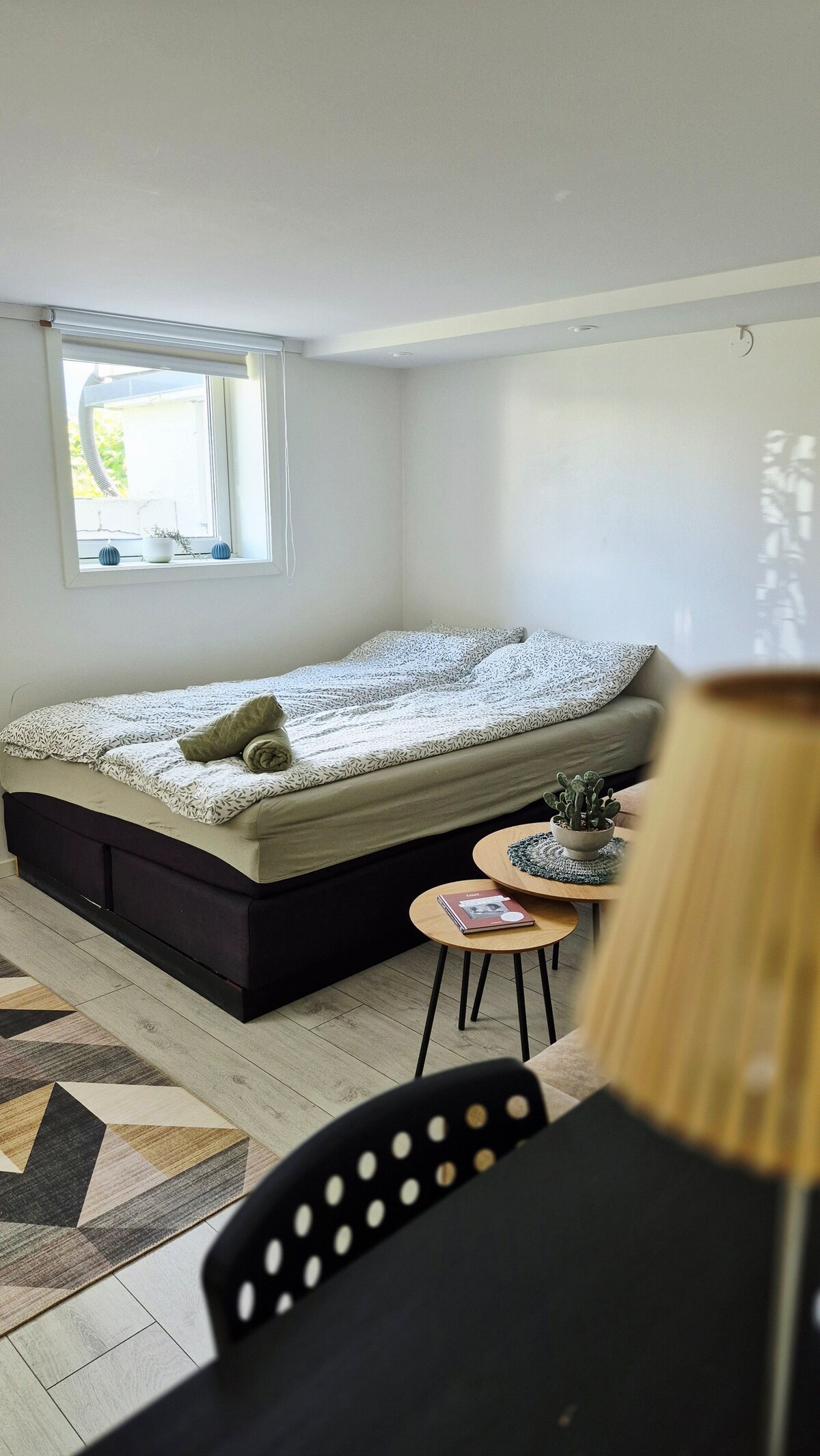 Ettroms studioleilighet i kjeller på 34 m2 - som et romslig hotellrom med kjøkken ✨ Egen parkering, egen inngang og enkel innsjekking med nøkkelboks. Passer perfekt til 1 eller 2 voksne (par). 🛏️ God kontinentalseng soft/medium og DreamZone Gold overmadrass 😴 📺 TV med Cromecast som kan vendes mot seng eller mot lenestoler - Turområder utenfor døren - 950m Kiwi - 500m Padel senter + Sporty24 Express - 800m Nes badebrygge - 1,4km Klopp strand