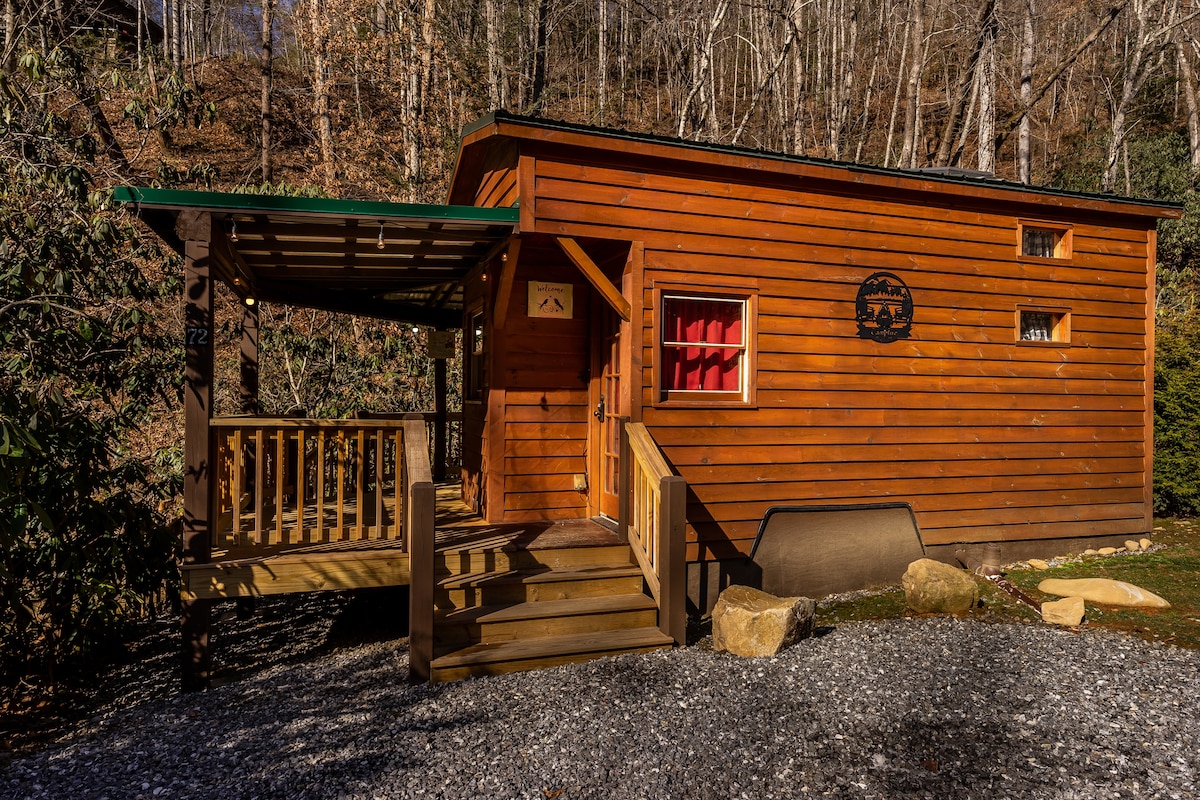 Grab the camping gear and firewood!The Campfire Tiny Home is located in our private Tiny Home community only 5 minutes from downtown Bryson City, NC. We just completed it with a beautiful covered porch by the creek. Inside you will find a stocked mini kitchen for cooking, electric fireplace, full bathroom with shower, a queen size bed, and TV. Walk off the porch and you have your own private area by the creek with a firepit and charcoal grill Don't forget the smores! :)