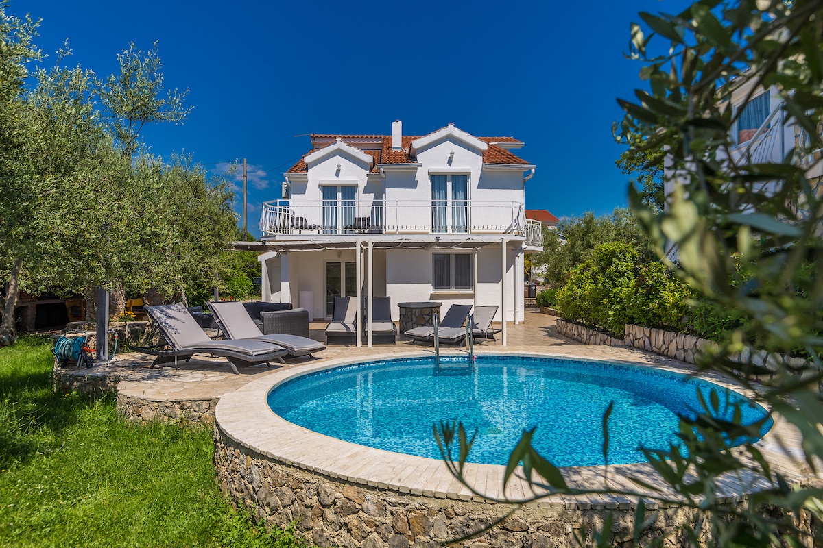 Spacious holiday house in Brzac, island Krk for up to 10 persons. The house spreads over two levels and consists of five bedrooms, two bathrooms, kitchen with dining area, living area and garden with swimming pool. Outdoor sitting/dining area, terrace with barbecue and a parking spot are at your disposal. The house is an ideal choice for bigger families or a group of friends. Pets are welcome too!