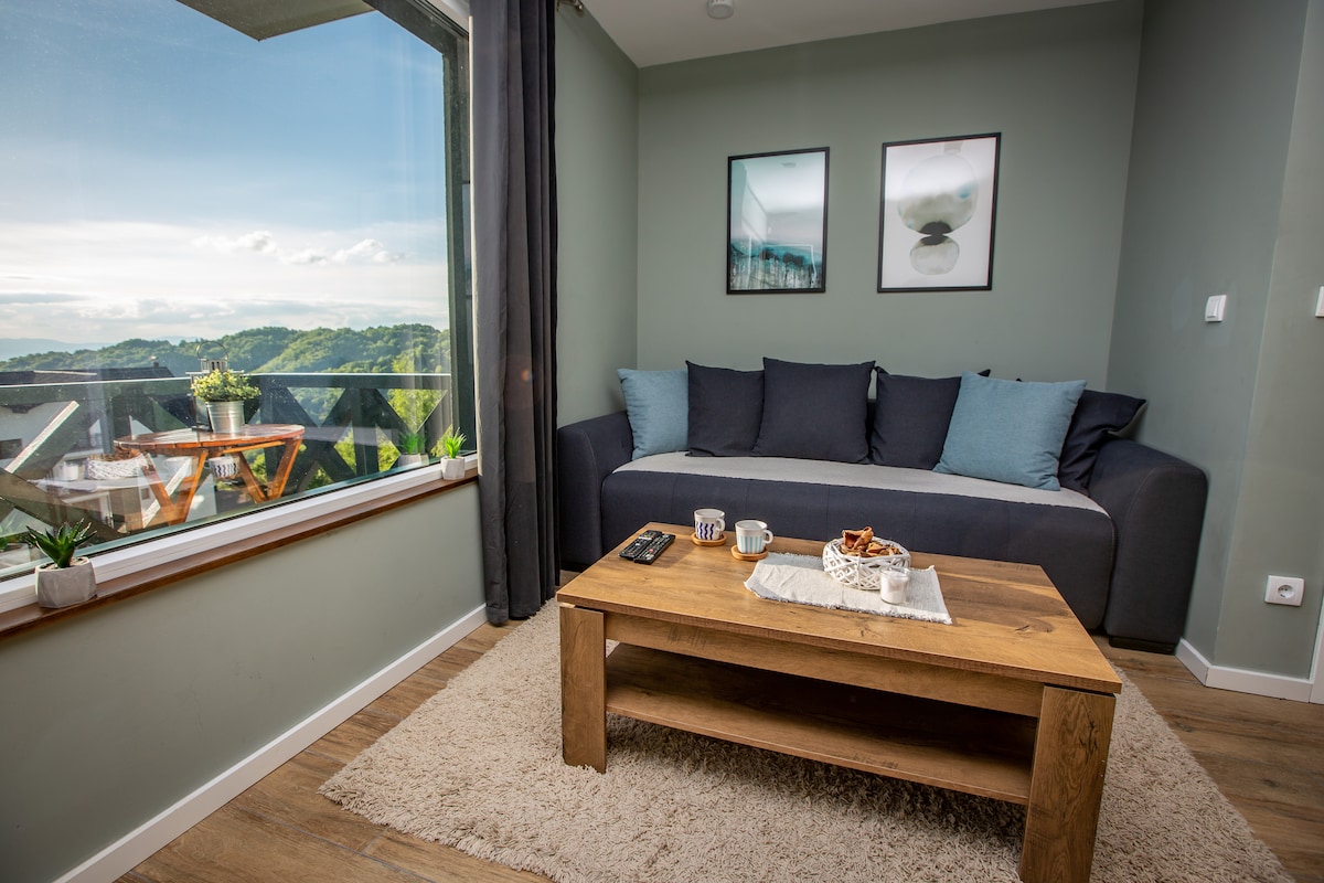 Sun facing,at1500m elevation,brand new apartment,decorated in lovely mountain style with astonishing mountain view.Only 2km from closest skiing lane,in quiet neighborhood with wonderful mountain view & evergreen forest around. Fully pawed road with public lights connecting it to main road. Grocery shops, hotels and restaurants are in close walking distance. No stairs and no uphill/downhill walking is required to reach your warm and comfy apartment from private parking just in front of the house.