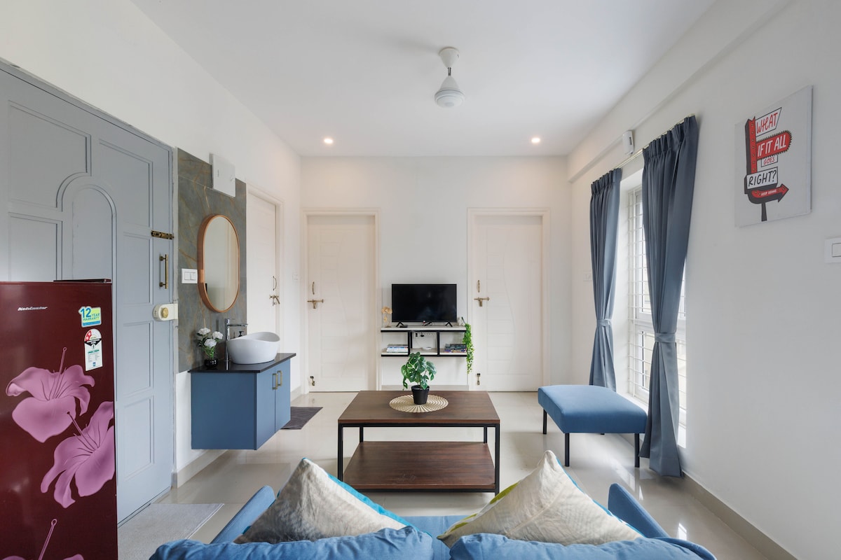 Spacious 600 square feet Designer 1BHK Suite with Private Balcony | High-Speed fibre optic Wi-Fi & Smart TV with streaming platforms, Work/Dining Desk, 24/7 power backup for uninterrupted work and comfort |Luxe King Bed & Orthopaedic Mattress ,wooden wardrobes for storage | fully equipped Kitchenette | Couch Bed in living room , Max.Occupancy 4 | Elevator access, professional housekeeping and access to paid laundry on site for long stays| Located in Central Bangalore | LGBTQIA++ Affirmative