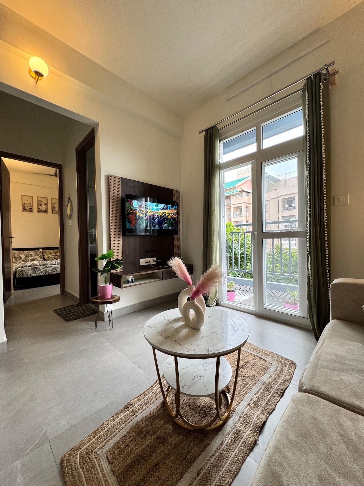 We would love to host you in our 1 BHK (EARTHY Homestay) that blends style with an earthy, peaceful vibe & unbeatable panoramas. - Balcony Oasis: Forest view + cinematic sunsets at 200 m - Prime Locale: 2 min to NIFT & 3 min to 27th Main’s cafés, boutiques & street‑food - Serene Interiors: Queen bed, ambient lighting & lush live plants - Work & Play: High‑speed Wi‑Fi, Large TV and fresh air Experience style, serenity & spectacular sunsets—all in one cozy retreat! - 5th floor (No Lift)