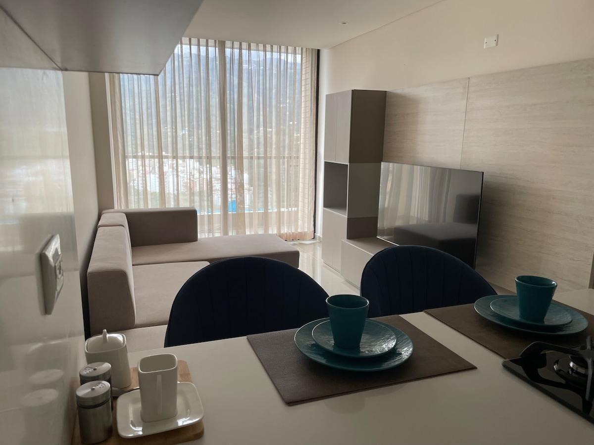 Una Vista Increíble, Disfruta de un Apto Moderno y Bien Equipado. Haz Fluir tus Ideas en el Espacio de Trabajo que incluye Monitor de 27 in, Silla Ergonómica y Tablero. Sumérgete en el Placer Cinematográfico con Netflix, Disney +, Star +, los Emocionantes Eventos Deportivos en Espn, los TVs son UHD, de 65 in con Sonido Envolvente y 50 in. Relájate en la Piscina Panorámica, Disfruta del Sol y el Aire Libre con altura. Comparte y Crea Actividades en este Bonito Apto. Te Esperamos