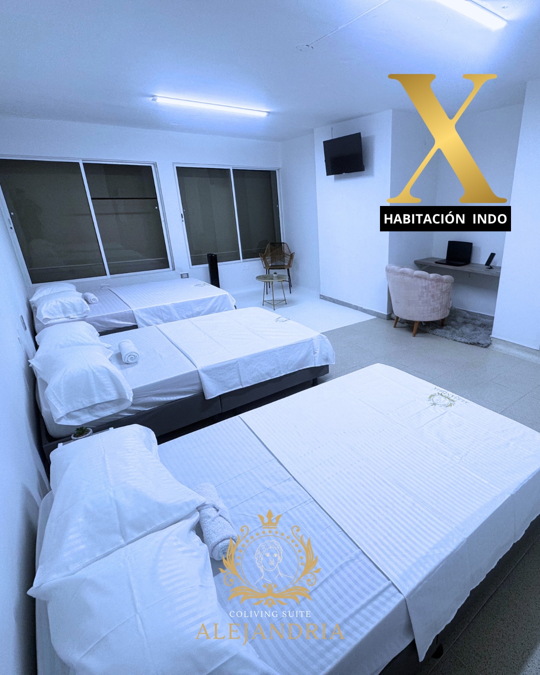 Coliving inspirado en Santorini y la grandeza de Alejandro Magno. Espacios blancos, toques azules y diseño industrial crean un ambiente único. Habitación privada hasta para 6 personas 3 camas dobles, baño privado, Smart TV, Escritorio de estudio, Clóset, Ventilador… Zonas comunes, Terraza bar, Gimnasio, Cafetería, “Incluye desayuno”. Estamos en la mejor zona de Bucaramanga, cerca de todo… Aquí no solo te hospedas... conquistas. Vive con honor. Vive Alejandría. HABITACIÓN X INDO