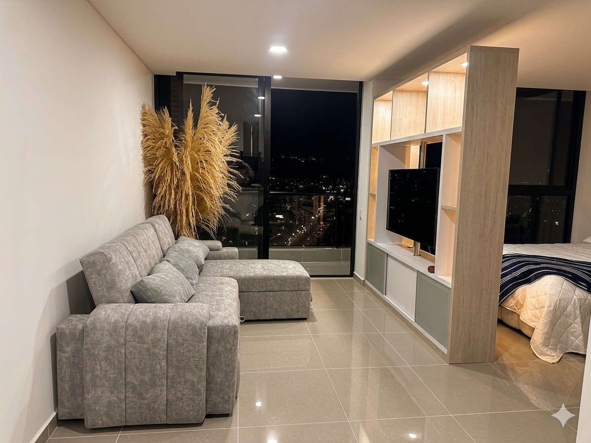 Apartaestudio Premium Disfruta de una estadía elegante y acogedora, ubicado en el corazón de la ciudad • Balcón privado con vista panorámica a la ciudad • Piscina exclusiva con jacuzzi en el edificio • WiFi de alta velocidad • Cama premium y ambiente acogedor • Cocina completamente equipada • Smart TV 55” streaming • Zona céntrica rodeada de restaurantes, cafés y supermercado Ubicación inmejorable y todo lo necesario a pocos pasos 5 minutos del centro comercial el cacique, el mejor de la ciudad.