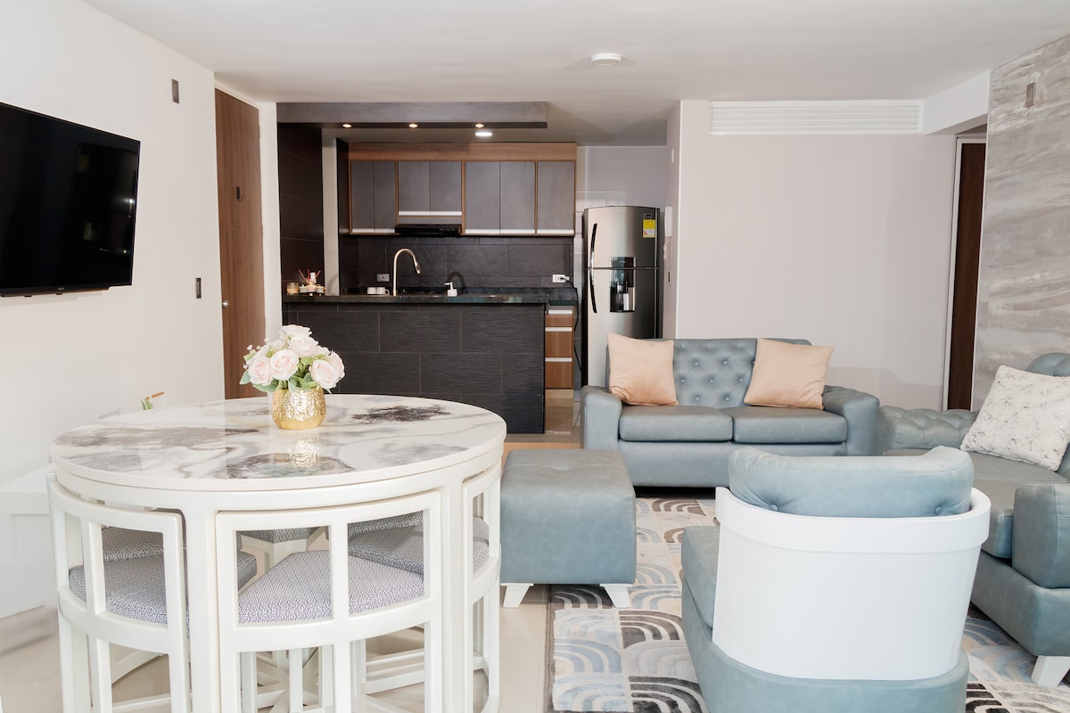 ¡Queremos ser tus anfitriones! Permítenos mostrarte por qué deberías reservar con nosotros: 1. La mejor ubicación de la zona 2. Apartamento entero 2/2 3. Diseñado para 4 huéspedes, 2 camas Queen 4. Completamente dotado. 5. Tv inteligente 6. Wifi 7. Parqueadero privado (1) 8. Lavadora. 9. Zona tranquila y segura 10. Condominio con piscina adultos y niños, sauna, turco, gimnasio. 11. A 7 min de la Foscal y la Cardiovascular.
