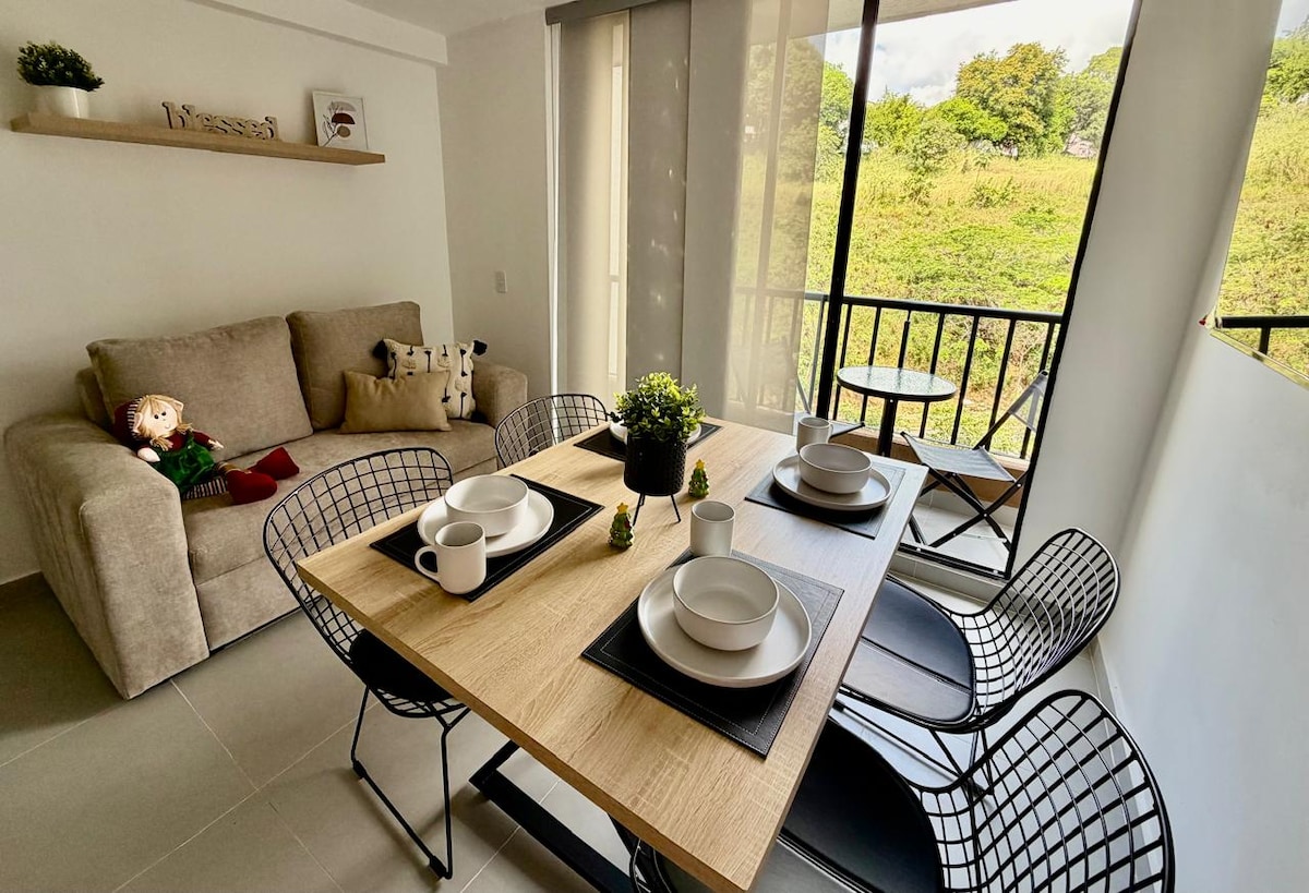 Disfruta de una experiencia de lujo en este lindo apartamento. Cerca a los centros comerciales del área metropolitana, a Neomundo y centros médicos. Cuenta con parqueadero. Apartamento nuevo con dos habitaciones, dos baños, cocina abierta y una sala cómoda. En este lugar podrá disfrutar de una gran vista de Bucaramanga y Floridablanca. La habitación principal cuenta con aire acondicionado, las habitaciones cuentan con Smart TV. Podrás disfrutar de acceso a internet de fibra óptica.
