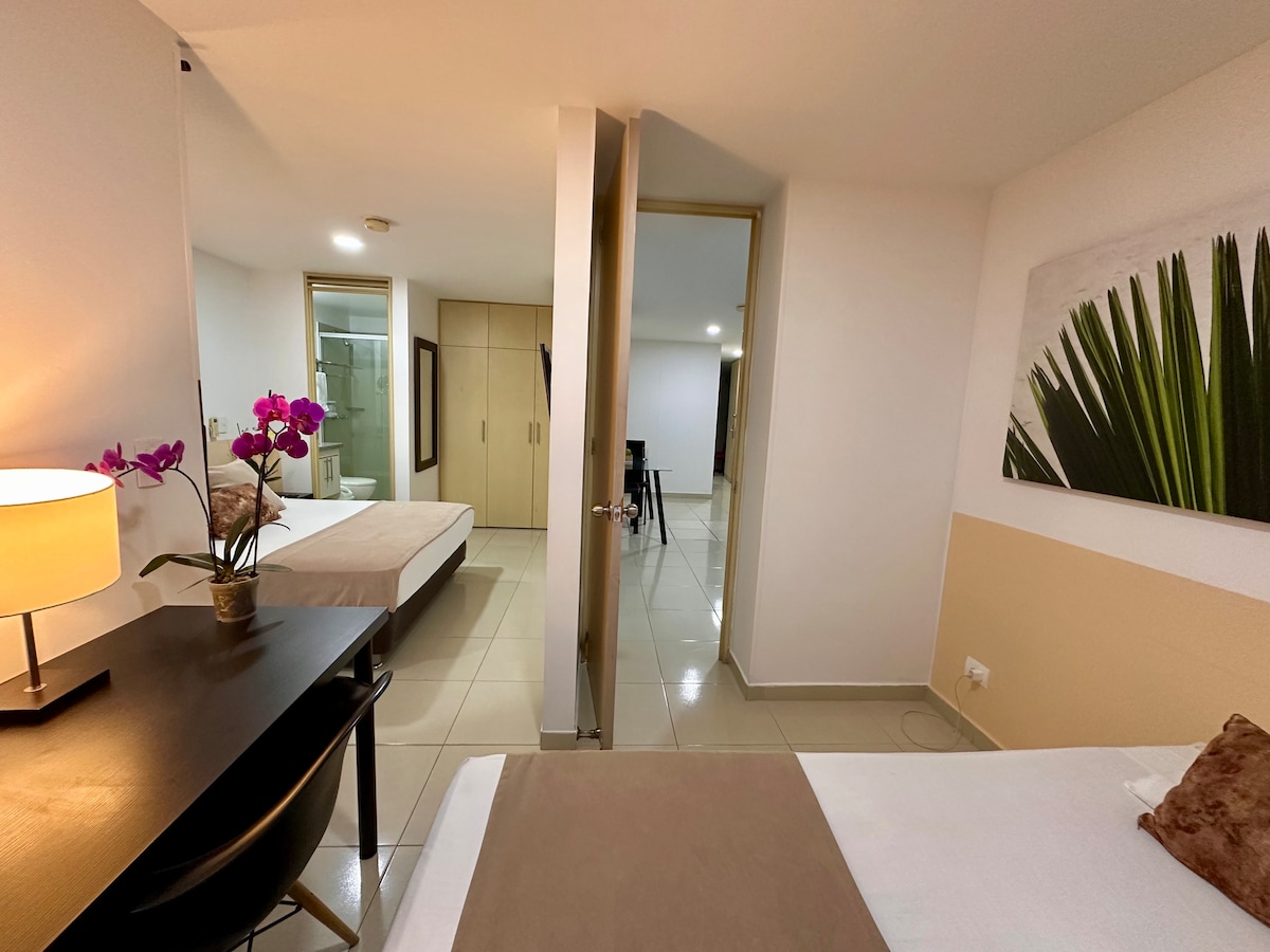 Aparta estudio con Amoblamiento para 4 personas en una zona muy central de la ciudad . El apartamento es de 39 m2 tipo suites hotelera en un solo ambiente dispuesto con una cama Queen y dos camas sencillas . Cuenta con un aire acondicionado , un solo baño , cocina , agua caliente, balcón y parqueadero . La Ubicación es muy central dos calles abajo de la k 27 y a 15 minutos caminando al sector de cabecera o al centro de la ciudad . El edificio dispone de una terraza en el piso 18 con jacuzzi.