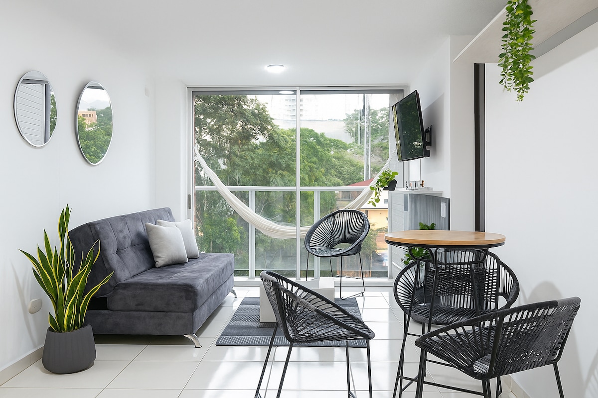 Relájate en este tranquilo y elegante apartaestudio renovado completamente por su suscrito anfitrión Super host de Airbnb. En la mejor ubicación de la ciudad, cerca a los mejores restaurantes y bares de la ciudad. En sus 39 mts2 puedes contar con moderna cocina Dotada con todo lo necesario para tu estancia, cómoda sala con amplio sofa , barra de desayuno, escritorio y silla, amplia habitación con cama matrimonial, smartv 40", ventilador, balcon y baño privado con agua caliente.