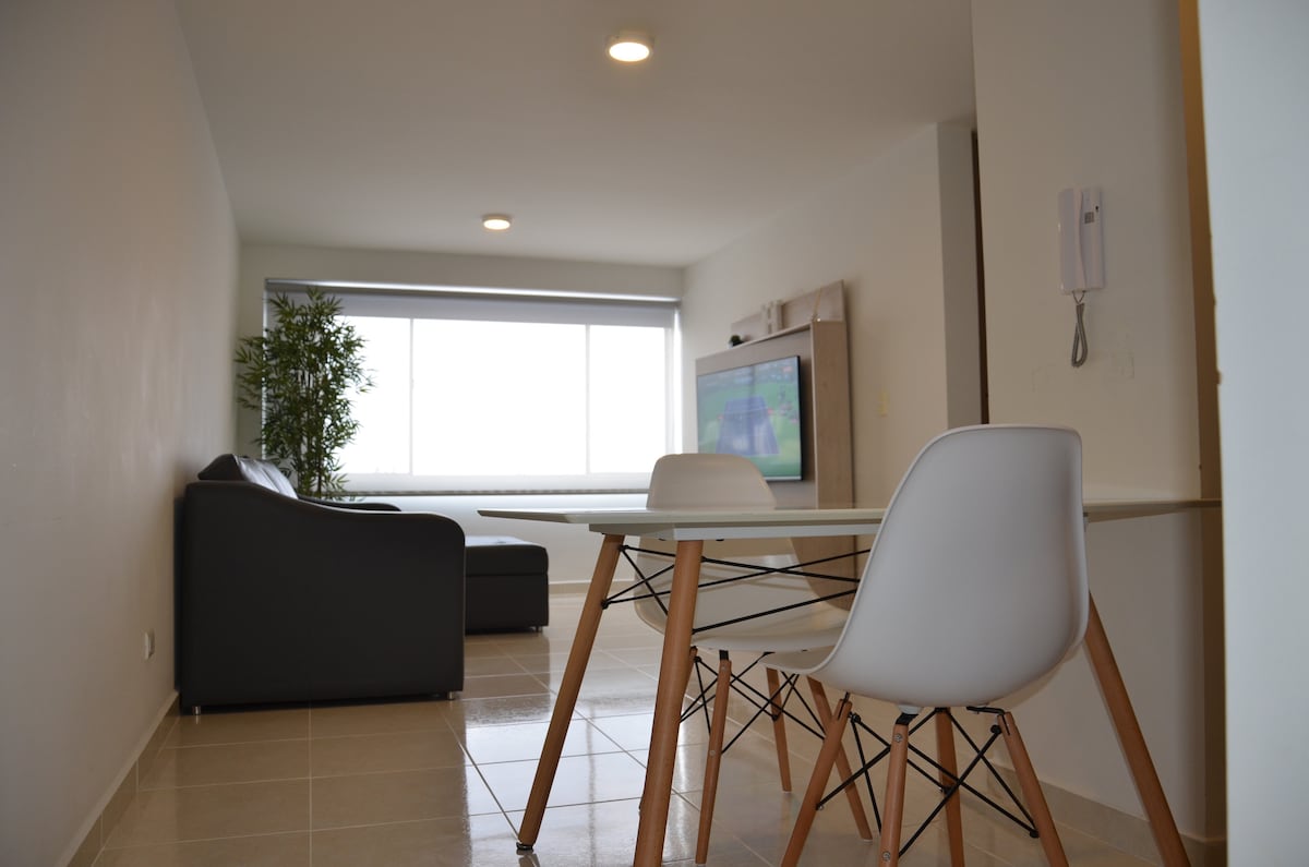 Moderno y confortable Apartamento tipo Loft para 2 personas remodelado recientemente por el suscrito anfitrión Súper Host de Airbnb. Ubicado en un primer piso, entrada independiente y en un área de 25 metros cuadrados, consta de cocina con estufa a gas, completo equipamiento de cocina, refrigerador, barra de comedor con 2 sillas, escritorio plegable con silla, cama matrimonial con 2 mesas de noche, ventilador de techo, televisor de 32 pulgadas con sistema Roku y amplios closets.