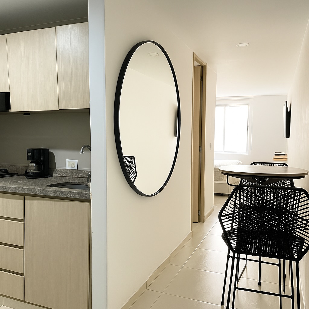 Aparta estudio nuevo de 48 m2, con parqueadero, muy bien ubicado en área residencial de Provenza y cerca a reserva forestal, zona comercial y bancaria, terminal de transporte, fácil salida al anillo vial y hacia el aeropuerto.....cuenta con Wifi, nevera, lavadora, ventilador cocina integral dotada (menaje), zona de lavado, tv pantalla plana, sala comedor.