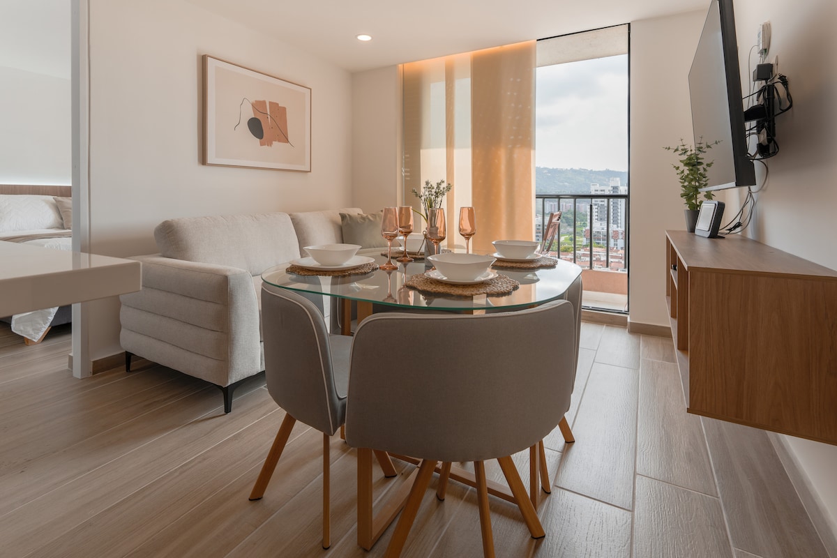 Beautiful brand new apartment. 10th floor with amazing sunset view. Central location. Residential and safe area next to the Cacique Mall and Neomundo Convention Center, easy access to Carrera 33,Cabecera,Girón and Floridablanca. 2 bedrooms, 2 balconies, hammock, 2 bathrooms, 2 beds, an auxiliary bed and a sofa bed. Excellent lighting and ventilation, 300mbps WIFI, 2 TVs with access to DirecTvGO, Netflix, Amazon and HBO. Ground floor of the complex with minimarket, bakery, pharmacy, among others.