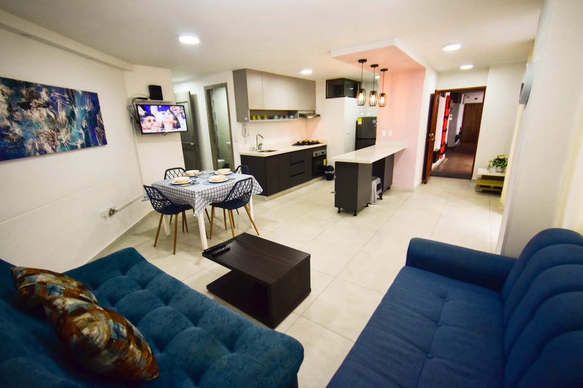This centrally located apartment is ideal to enjoy a pleasant stay if you are traveling for tourism or work, has a capacity for 4 people in two rooms, the main room has a double bed, the additional room has a single bed and two comfortable sofa beds in the living room, fully equipped kitchen and bathroom with hot water. It has an excellent movistar Internet bandwidth 300 Mpbs, cable TV, netflix, work furniture and is located a few minutes from the sites of interest in the city.