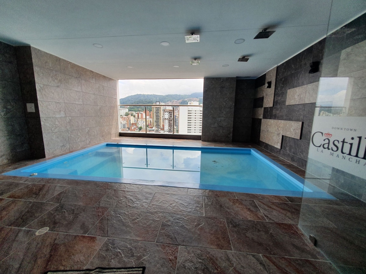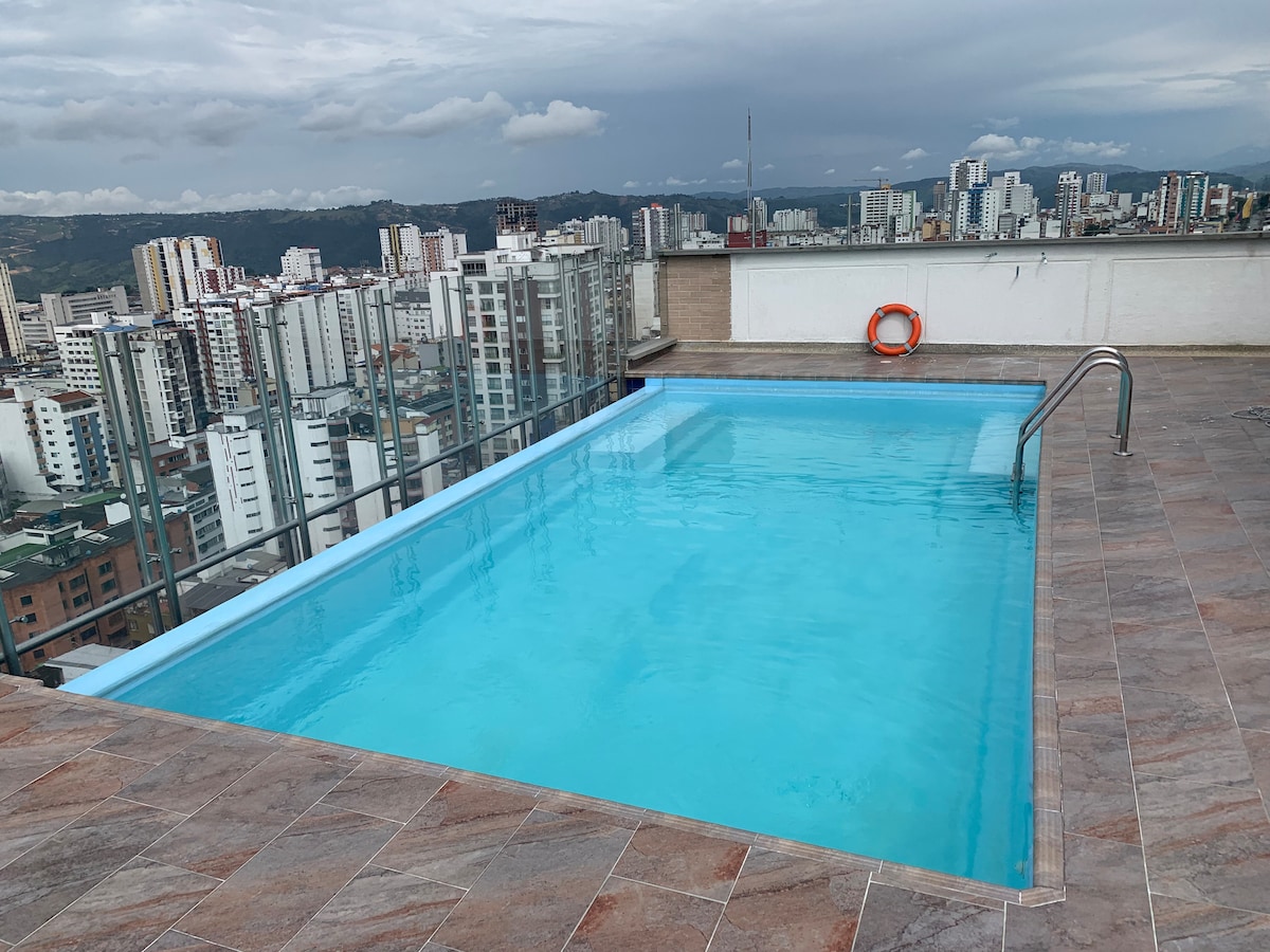 Apartamento de 45 Mts cuadrados, Iluminado, con excelente ubicación, ascensor, wifi de 350 megas, bien dotado estufa, nevera, lavadora, horno microondas, agua caliente, caja de seguridad, goza de muy buena vista de la ciudad, Encontrarás todo lo que necesitas a tan solo unos pasos, cerca de Zona Bancaria, Supermercados, Centros comerciales, zona segura, clínicas, Parqueadero, cerca al estadio y complejos deportivos, de fácil acceso a transporte público, vigilancia, edificio de buen vecindario
