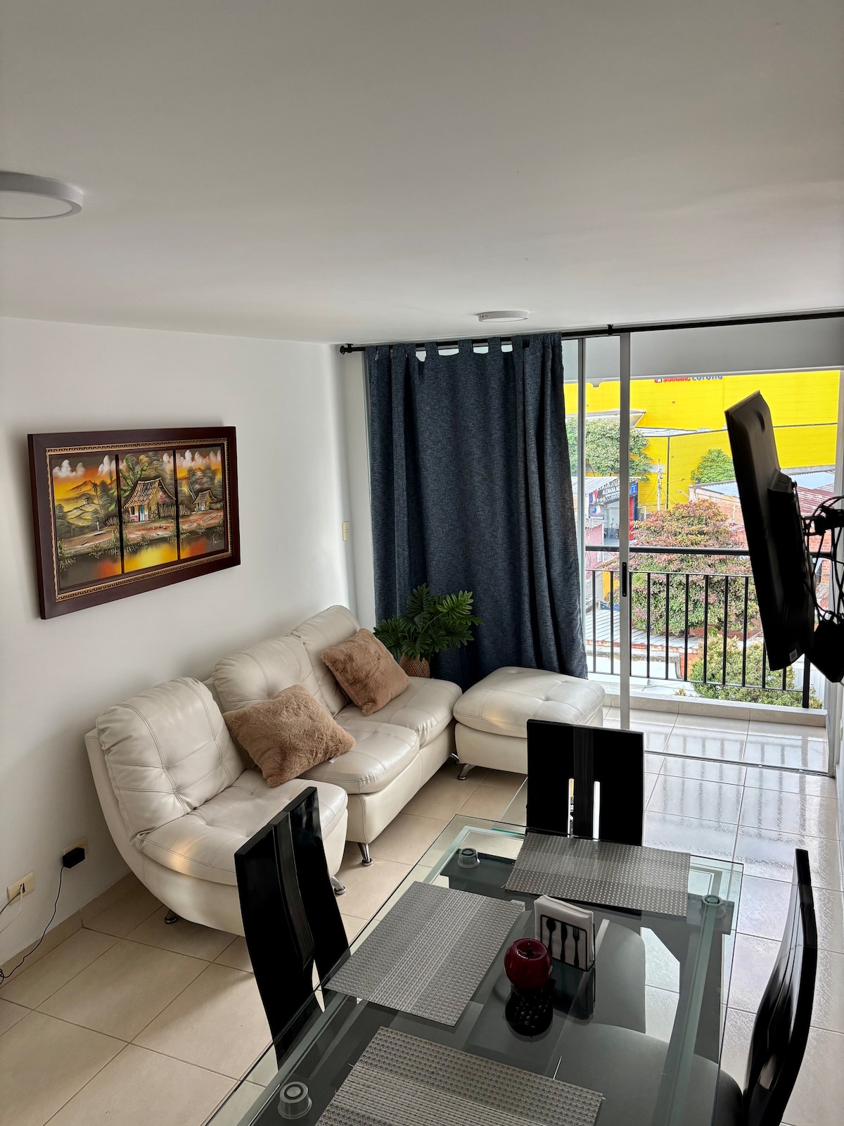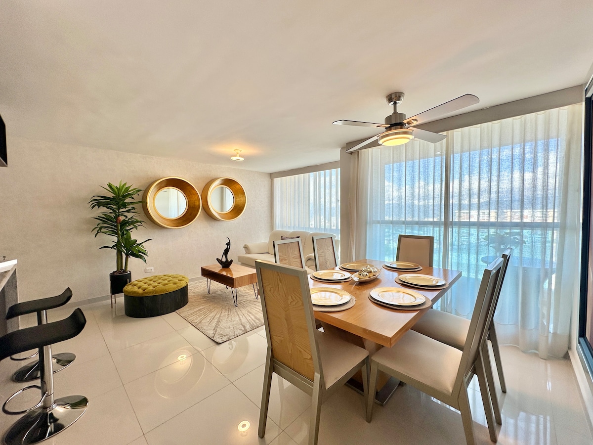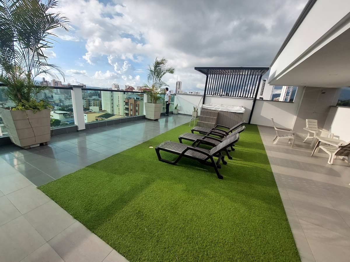 Beautiful brand new apartment. 10th floor with amazing sunset view. Central location. Residential and safe area next to the Cacique Mall and Neomundo Convention Center, easy access to Carrera 33,Cabecera,Girón and Floridablanca. 2 bedrooms, 2 balconies, hammock, 2 bathrooms, 2 beds, an auxiliary bed and a sofa bed. Excellent lighting and ventilation, 300mbps WIFI, 2 TVs with access to DirecTvGO, Netflix, Amazon and HBO. Ground floor of the complex with minimarket, bakery, pharmacy, among others.