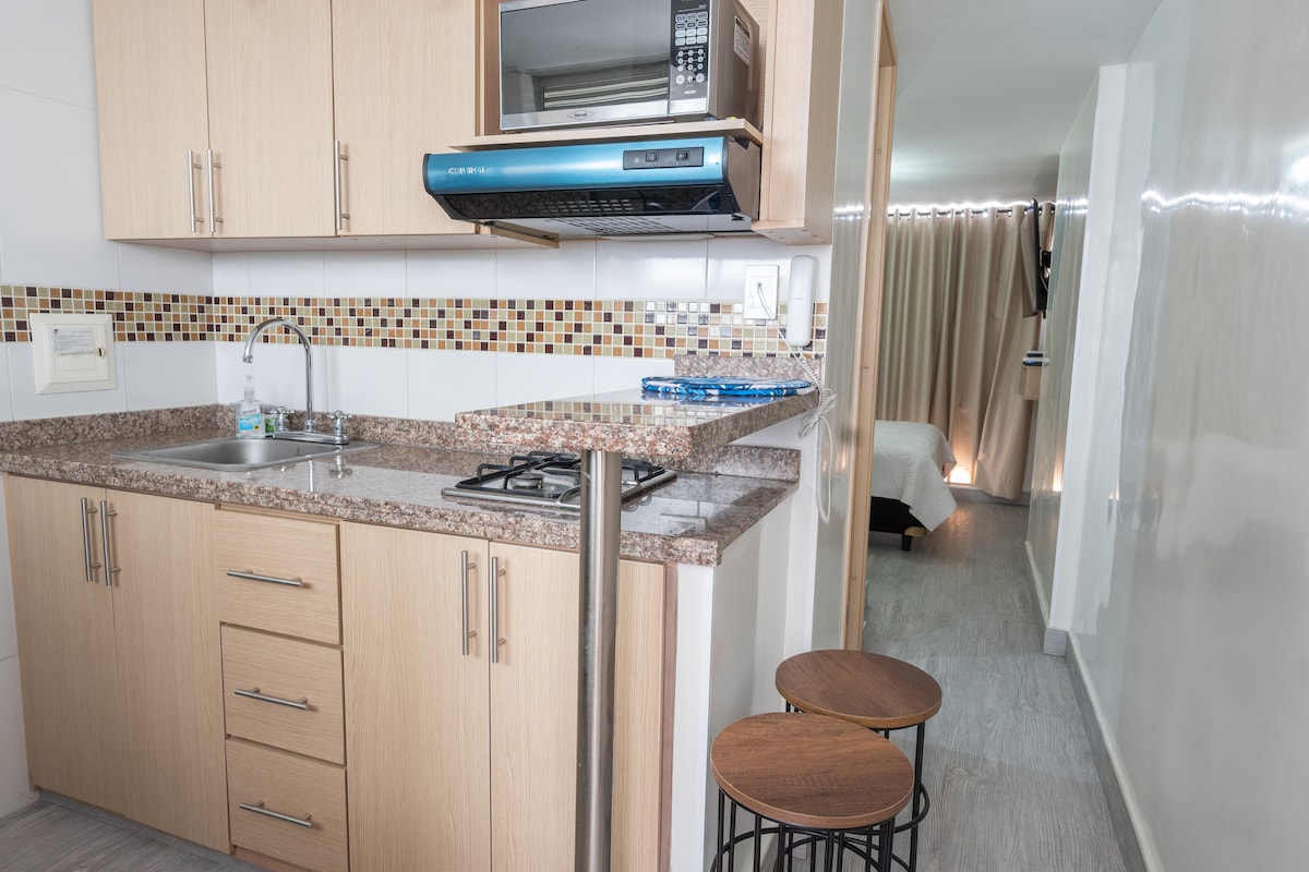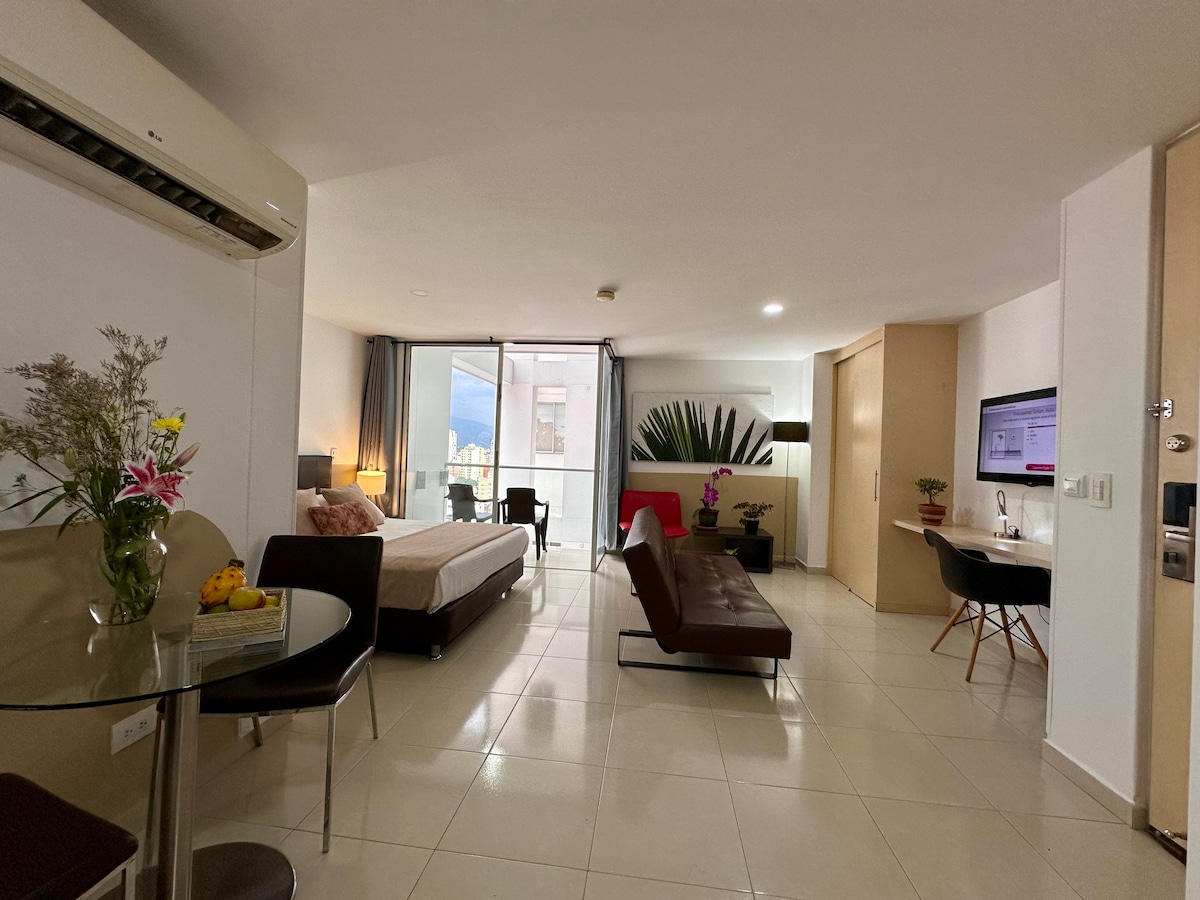 Apartamento tipo Loft con espacios abiertos. Cuenta con amplia habitacion con closet, sala, comedor, un exclusivo balcon en el apartamento con inmejorable vista hacia el norte de la ciudad, que le proporciona iluminación y ventilación excepcional. Cuenta con wi-fi, TV, ascensor vigilancia las 24 horas. Todo lo que necesitas para disfrutar de un hospedaje acogedor.