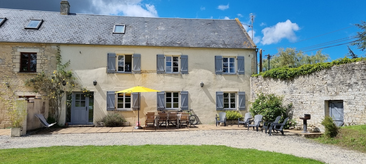 Jolie maison en pierres du Bessin pour séjours en famille ou entre amis en Normandie. Vous apprécierez le calme, la baie vitrée qui ouvre sur le jardin, la terrasse, la literie haut de gamme. La maison est située dans un hameau tranquille à 2 kms des commerces , 10 mn de Bayeux, 25 mn de Caen et de la mer. Vous pourrez ainsi visiter les plages et sites du Débarquement, le château de Caen ou les sites naturels du Bocage. Maison indépendante sur la propriété avec jardin non-clos.