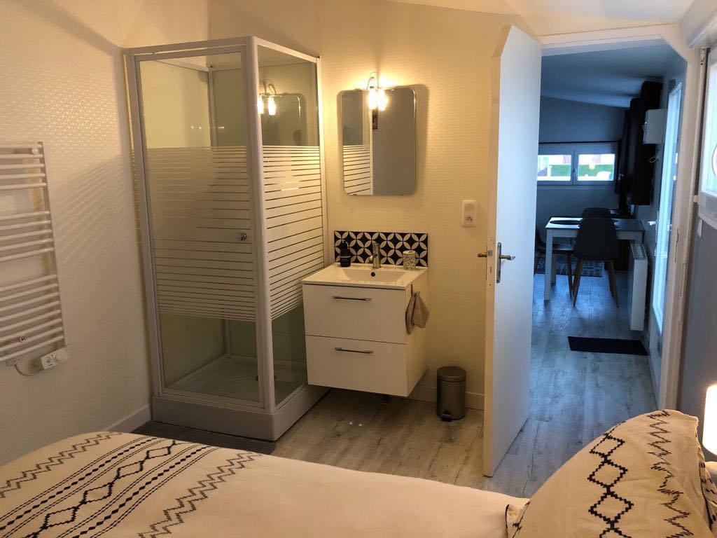 location pour 2 personnes de 19 m2. Terrasse extérieure avec jardin (jacuzzi de mai à fin septembre,table- chaise et barbecue en saison). Intérieur comprenant : salle de bain WC- Douche lavabo. Coin cuisine : évier- micro-onde- four, frigo, cafetière, bouilloire, vaisselle, table et chaises, TV . Coin lit : en mezzanine lit 2 personnes standard 140 avec oreillers, couette- alèse, Drap fourni. Non PMR En option. Possibilité de petit-déjeuner . situé à 10 kms de Bayeux 13 kms de la mer.