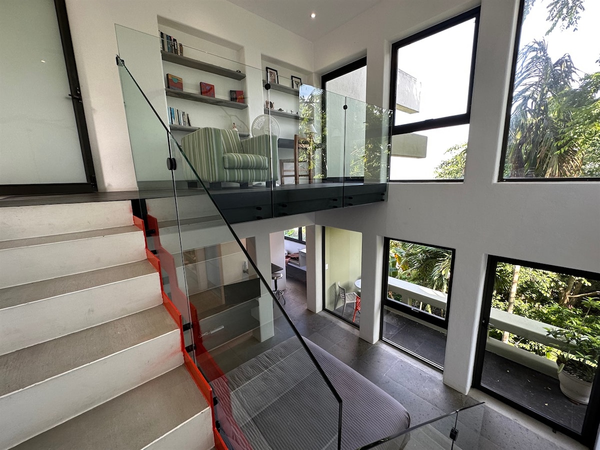Modern-beach house, lots of daylight, private, quiet, behind the main square, two blocks from the beach, beautiful jungle & sunset views, pool, garden, funky and comfortable. Located within two-three blocks from all the main business (walk distance to town & beach) yet on a quiet neighborhood. We love art and design, so you'll get the feeling of a comfy house surrounded by details for a warm stay. Perfect for a getaway or long term stay + work by distance w/satellite internet service.