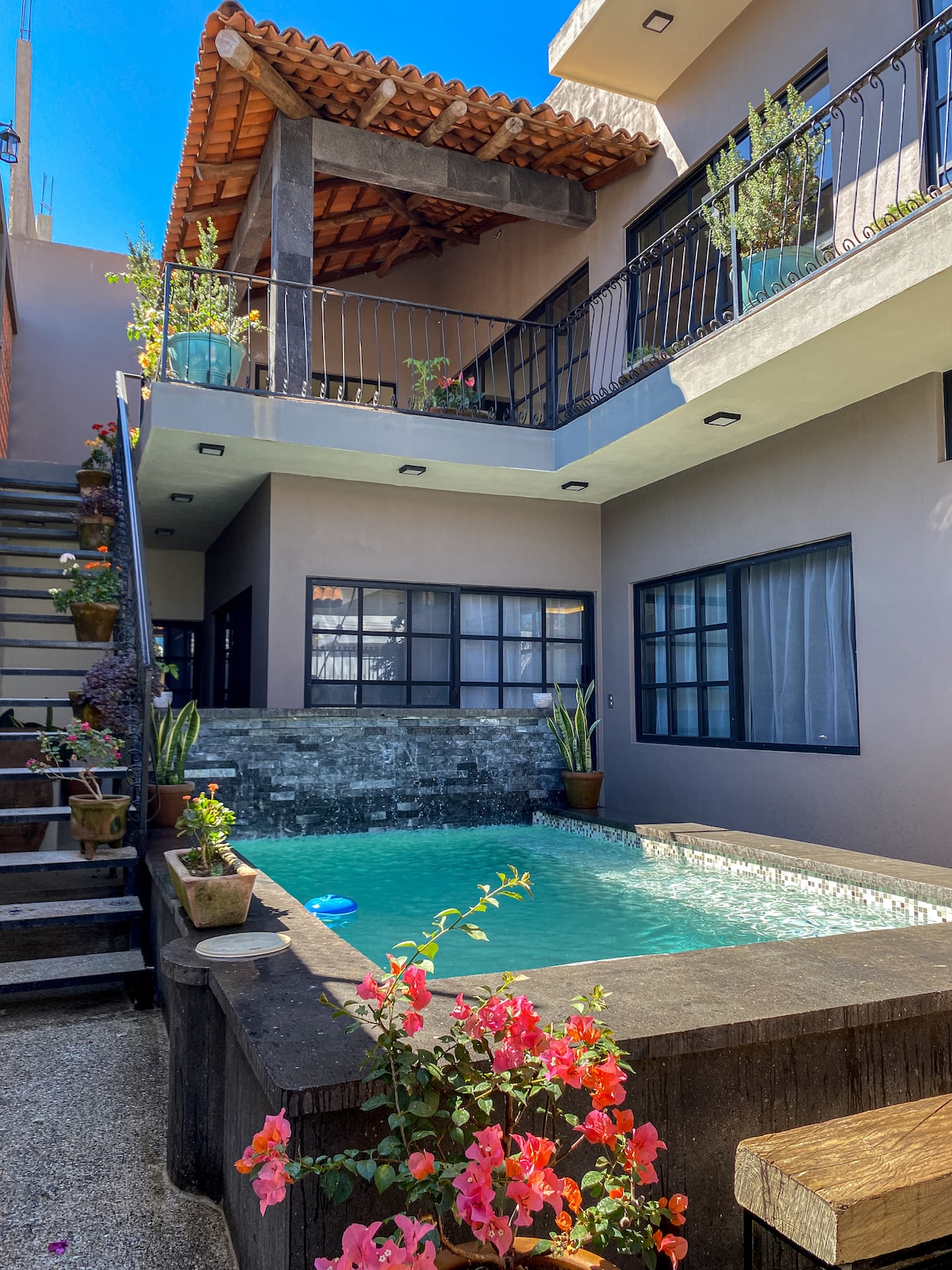 Welcome to our sunlit oasis just one block from Playa Bucerías. This stylish suite features a spacious terrace perfect for relaxing. Inside, enjoy comfortable seating, TV, and a fully equipped kitchen. Step outside to your plunge pool and sundeck, ideal for cooling off and unwinding. Rest in a king bed for a peaceful night’s sleep. Optional car rental available to explore Bahía de Banderas and beyond. Note: daytime construction noise may occur in the area.