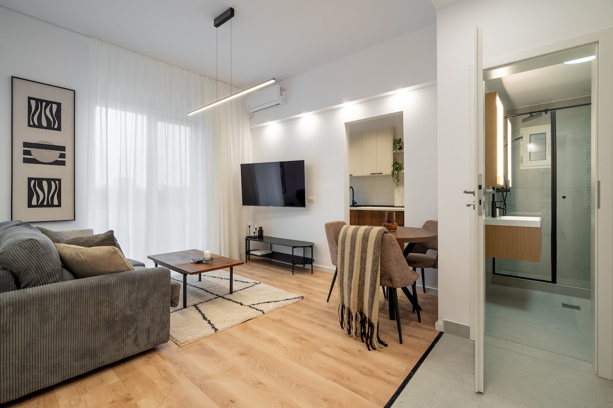 Welcome to your Home in Victoriei, your cozy retreat in the heart of the city! Designed to make you feel at home, this modern minimalist style combines warmth and elegance with a soothing palette of light brown, cream, and gray. The inviting bedroom features soft textures, natural wood flooring, and a serene ambiance, perfect for relaxation. Thoughtfully decorated, subtle accents, this space blends simplicity with comfort, creating a stylish and peaceful escape. Your home away from home awaits!