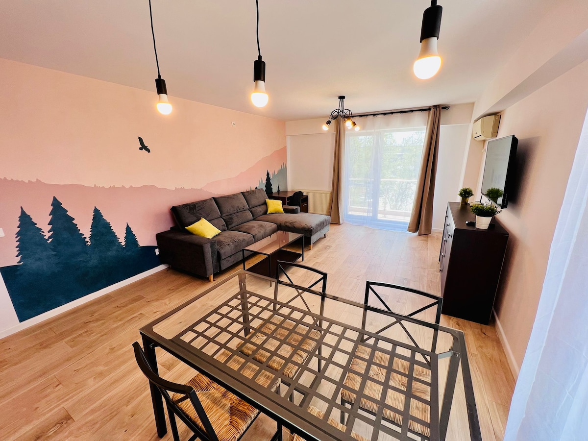 Enjoy a stylish experience at this centrally located residence in Militari Residence. This apartment features the following amenities: Private parking with a barrier Walls decorated with Stucco Veneziano 4K Smart TV with Netflix and Air conditioning The complex offers: indoor and outdoor pools, wet and dry saunas, jacuzzi, and a fitness center. The distance to the Wellness center is 500m, and to Aqua Garden it's 550m, approximately a 7-minute walk. The price for pool access is 70 RON per person.