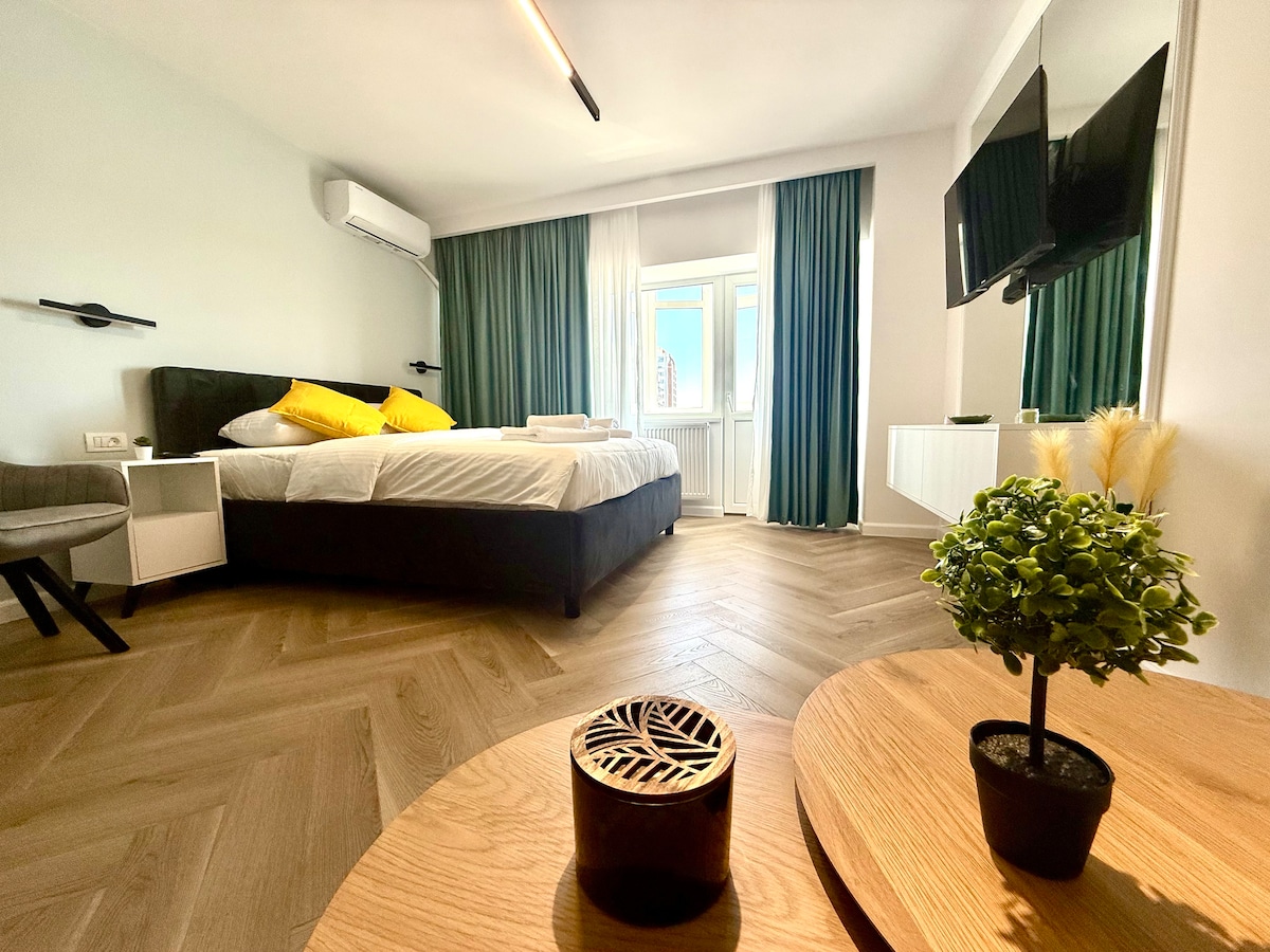 Spacious luxury 40 sqm studio in the heart of Bucharest, just steps from Old Town Bucharest. Recently renovated, the apartment features elegant decor, a comfortable queen-size bed (180×200 cm), a stylish sofa, a cozy balcony, a large fully equipped kitchen and a spacious bathroom with rain shower. Hosted by a Superhost with over 7 years of experience. Metro right next to the building. Coffee shop, cake shop, mini markets, fast food, ATM and currency exchange on the ground floor.