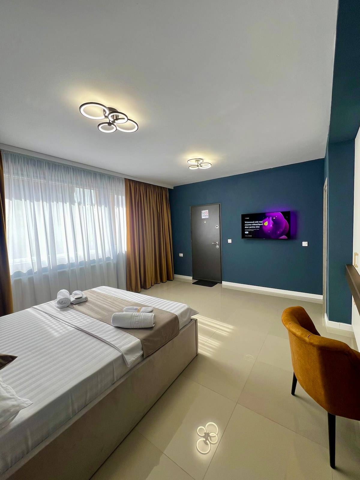 Our hotel blends comfort, style and convenience in one place. All rooms are newly built, with modern bathrooms and premium finishes. We’re close to the airport, Pipera offices, Therme and major studios, making travel simple. Guests enjoy a Portuguese-inspired restaurant, a covered smoking area, a water-jet pool and free parking. The atmosphere is relaxed, the service is friendly, and everything is designed to make your stay easy.