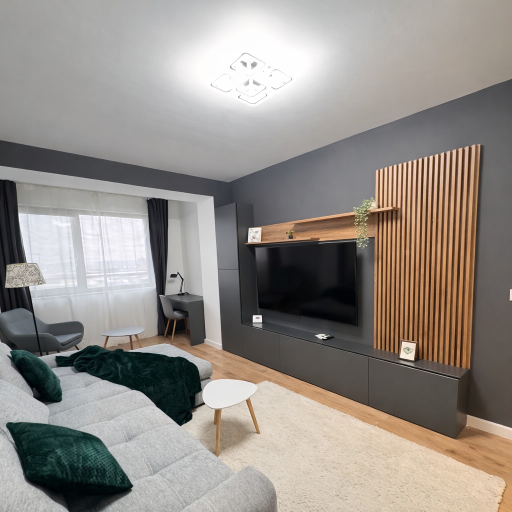 Welcome to your Home in Victoriei, your cozy retreat in the heart of the city! Designed to make you feel at home, this modern minimalist style combines warmth and elegance with a soothing palette of light brown, cream, and gray. The inviting bedroom features soft textures, natural wood flooring, and a serene ambiance, perfect for relaxation. Thoughtfully decorated, subtle accents, this space blends simplicity with comfort, creating a stylish and peaceful escape. Your home away from home awaits!