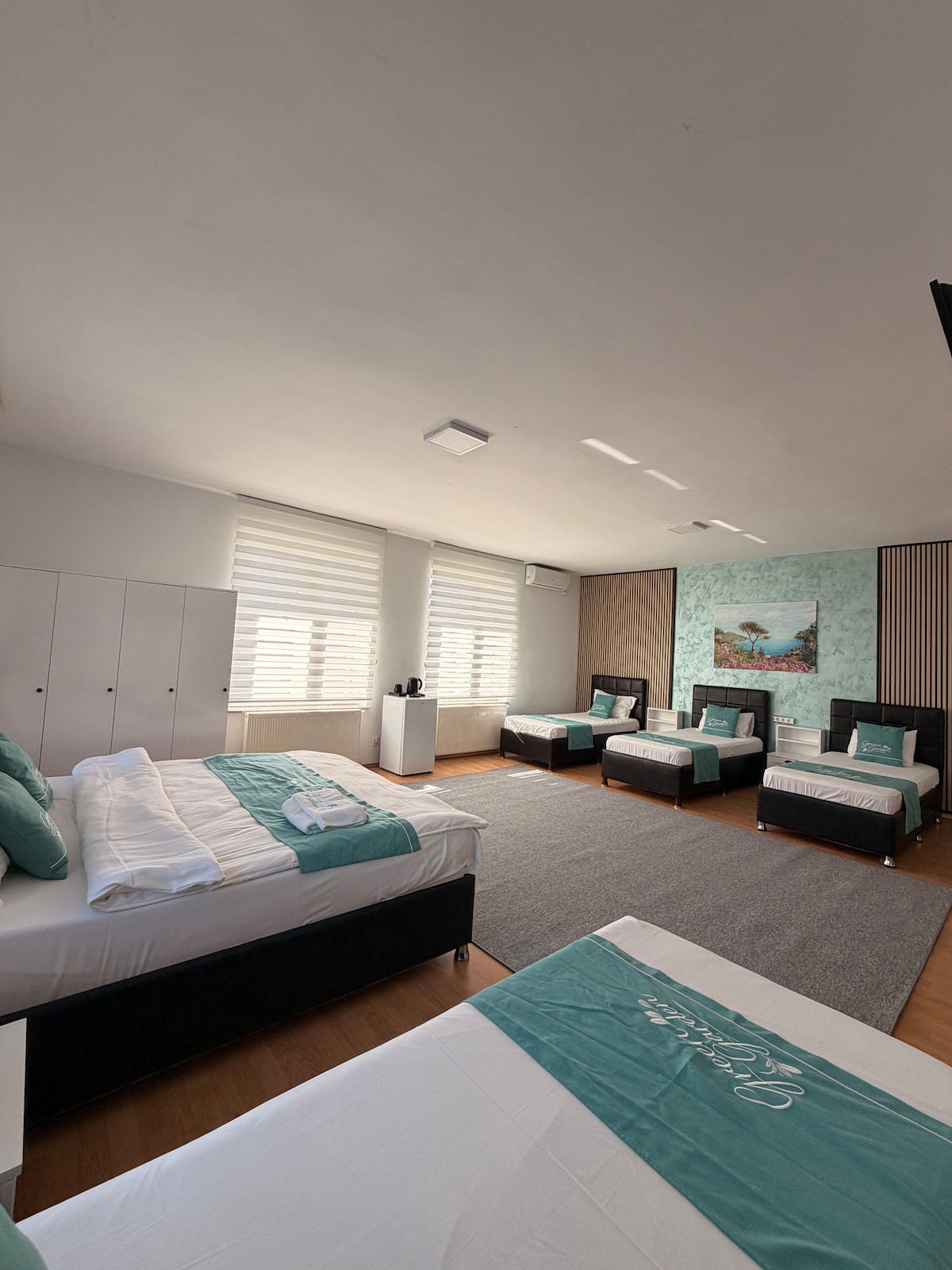 Bine ați venit în camera noastră modernă și confortabilă de tip hotelier, concepută pentru a vă oferi o experiență de cazare plăcută și relaxantă. Culoarea predominantă a camerei este albastru-suriu (alb-bej), care creează o atmosferă calmă și liniștită, perfectă pentru a vă relaxa după o zi plină de activități.