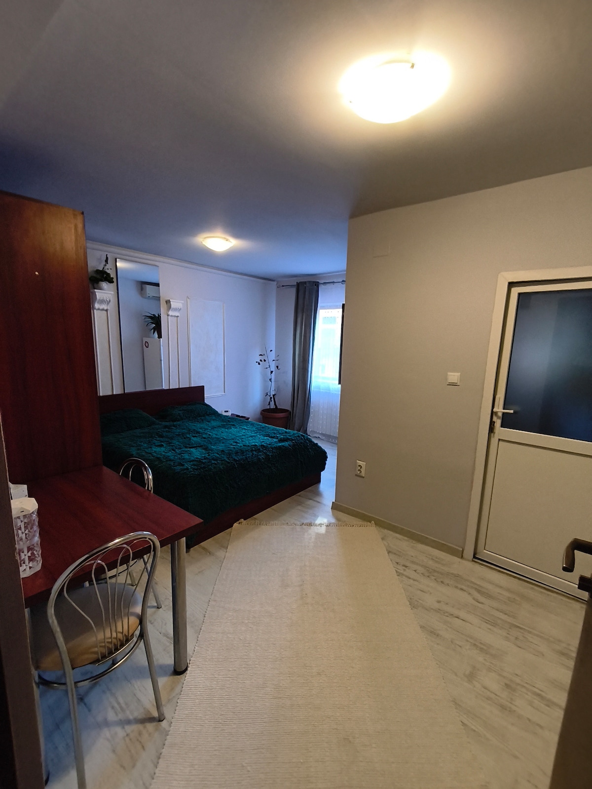 Camera privata de hotel tip garsoniera, compusa din dormitor cu chicineta tip open-space, baie privata cu dus. Camera beneficiaza de tv cu cablu, internet wifi, apa calda, incalzire in calorifer, frigider, cuptor cu microunde, fierbator de apa, plita electrica si chiuveta de bucatarie. Masina de spalat este intr-o camera tehnica si este de uz comun cu alti oaspeti din cladire.