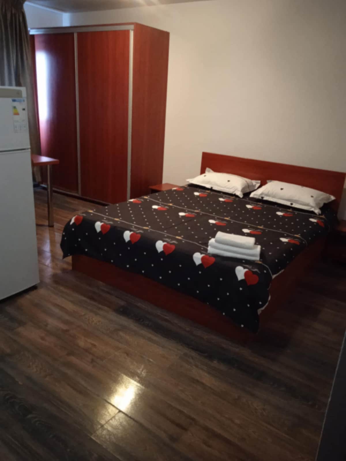 Camera privata de hotel tip garsoniera, compusa din dormitor cu chicineta tip open-space, baie privata cu dus. Camera beneficiaza de tv cu cablu, internet wifi, apa calda, incalzire in calorifer, frigider, cuptor cu microunde, fierbator de apa si chiuveta de bucatarie. Masina de spalat este intr-o camera tehnica si este de uz comun cu alti oaspeti din cladire.