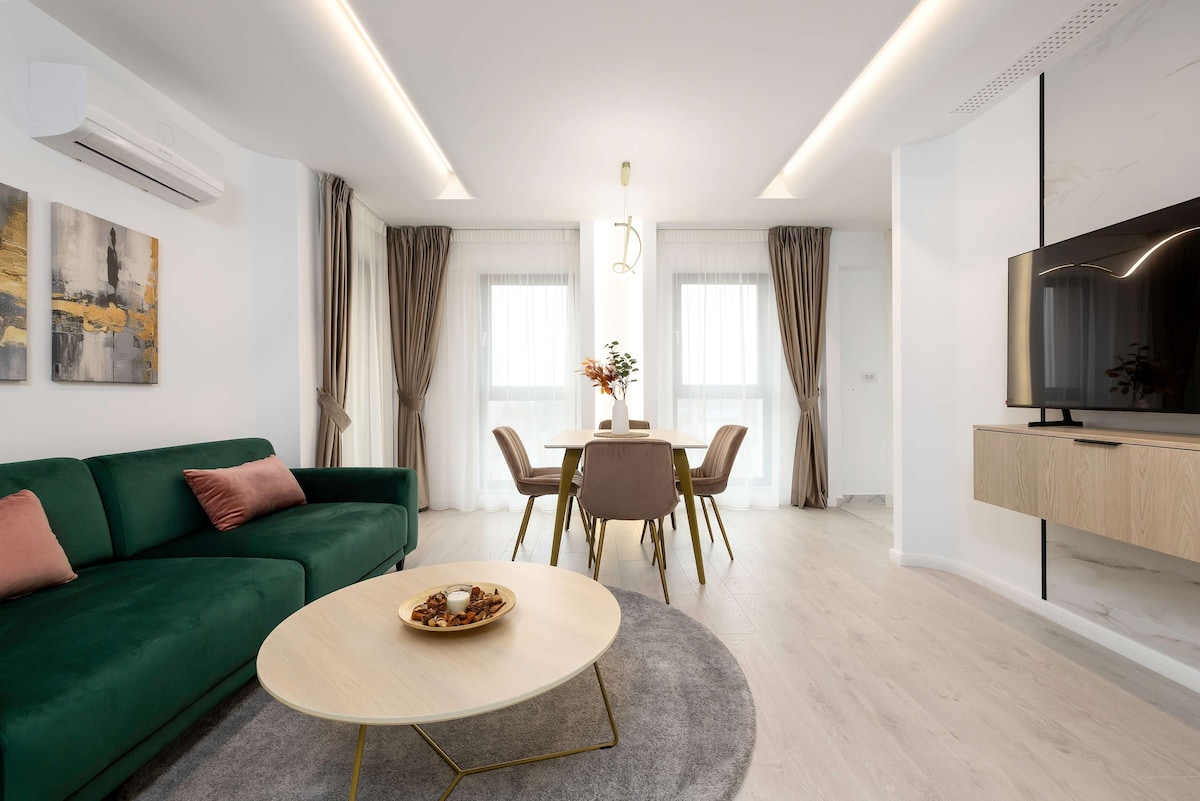 Experience luxury in our 1BD 1Bath apartment nestled in Bucharest's upscale Herastrau neighborhood. Revel in contemporary decor and premium amenities, like a well-equipped kitchen, high-speed Wi-Fi, and comfortable queen-beds Explore the city effortlessly with accessible public transportation and complimentary underground parking. ✔ Private Underground Parking ✔ High-Speed Wi-Fi ✔ Smart TV with Netflix ✔ Nespresso Coffee ✔ Stunning City Skyline View ✔ Private Terrace