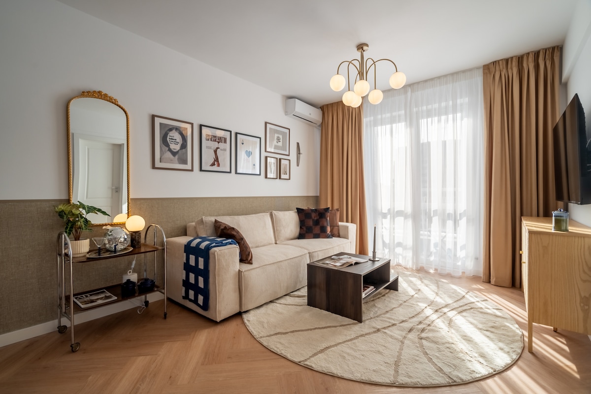 Riverline is a refined two-bedroom apartment in Bucharest’s most prestigious area near Calea Vicotriei and Old Town with breathtaking views over the river and city skyline. Elegantly designed with high-end finishes, curated décor, and abundant natural light, the apartment features a stylish living area, fully equipped kitchen, serene bedrooms, and a private balcony ideal for morning coffee or sunset moments. An exclusive stay for guests seeking comfort, style, and a prime central location.