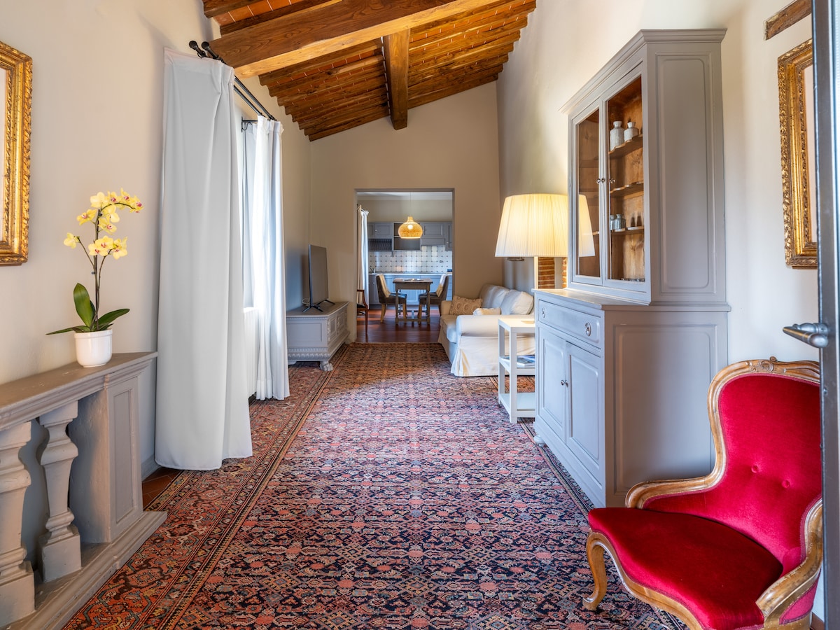 Feel close to the land in a rustic building on a Tuscan farm. Old stone walls, ceilings with exposed beams and terracotta floors are the backdrop to a characteristic apartment with fireplace. Plunge into an infinity pool for a unique view of the surrounding landscape. Dine outdoors, with the fresh air caressing you, sit and relax admiring the sunset under the ancient cypresses.