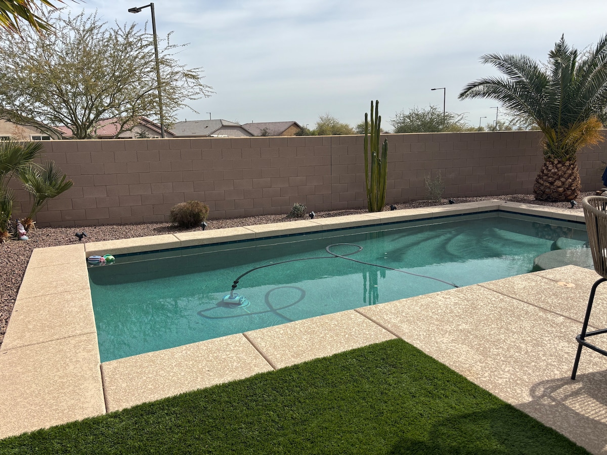 Comfortable family home with all the basics and a huge pool! 3 furnished bedrooms plus an office with a futon that turns into a double sleeper. All brand new furniture and appliances including an 8 person outdoor table plus comfortable Adirondack chairs, perfect for outdoor enjoyment! Come make yourself comfortable in this family friendly, safe neighborhood. Close to Goodyear's baseball stadiums and within 30 mins of so much entertainment.