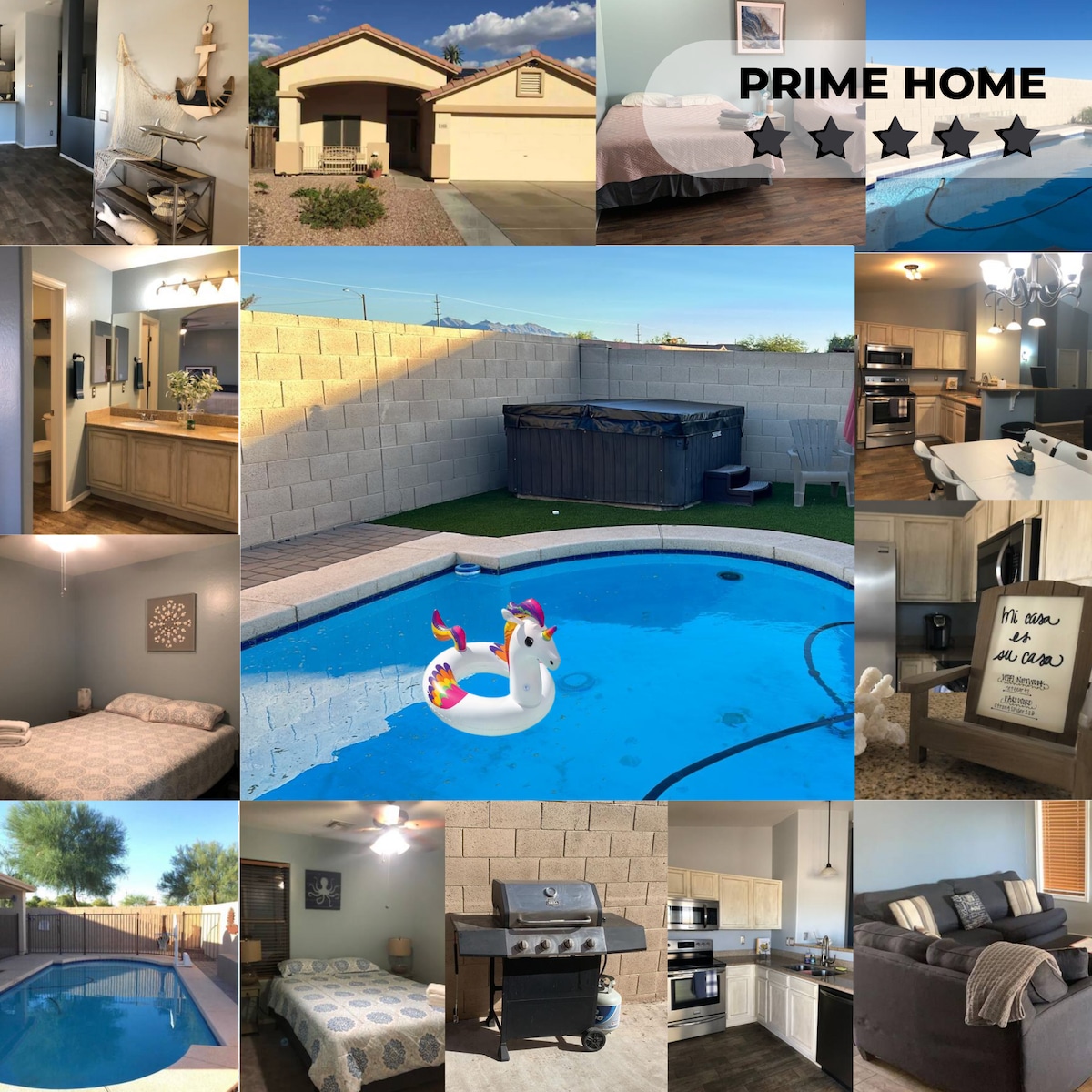 Welcome to the newly furnished Boho Chic style Vacation home. Nestled in a quiet and peaceful Goodyear community. You will be enjoying the perfect combination of indoor/outdoor living in this little Arizona oasis featuring outdoor heated pool (no extra charge) and golf putting green area. 10 minutes to all the dining and shopping. For the sports fans, we are only minutes away from Goodyear ballpark for baseball Spring training!
