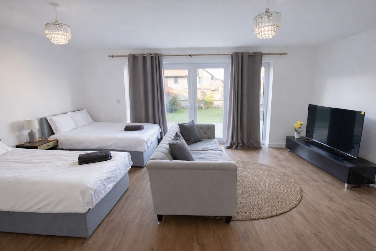 The Railway Inn MK A beautifully restored 1866 Victorian property, blending period charm with modern luxury. Unwind in the Jacuzzi bathtub or our private sauna, then slide onto an orthopaedic mattress with fresh cotton sheets. Top features: Sauna, Jacuzzi, fast full-fibre broadband, gaming lounge, pet-friendly, wheelchair-accessible ground-floor bedroom. Sleeps up to 8 guests — There are 3 double bedrooms. 1 double sofa bed, 2 sofas, and a travel cot which are available to use if needed..