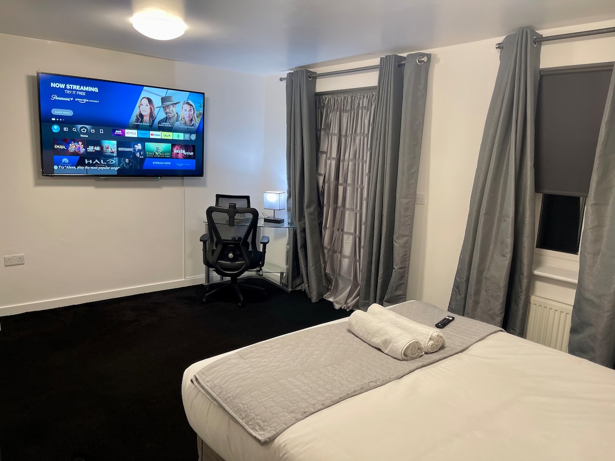 Clean, bright, comfy, luxurious townhouse in Milton Keynes with free parking and easy self-checkin. Housekeeping, linen, tea/coffee, shampoo etc provided. 4K TV in lounge and 3 bedrooms, free 200Mbps WiFi, Netflix, PS5. Kids playground nearby. Plenty of shops, bars and restaurants nearby. M&S supermarket just across the road. All the home comforts for groups of business travellers and families! Great base for Woburn Safari, XScape, MK stadium, Whipsnade Zoo, Bletchley Park.