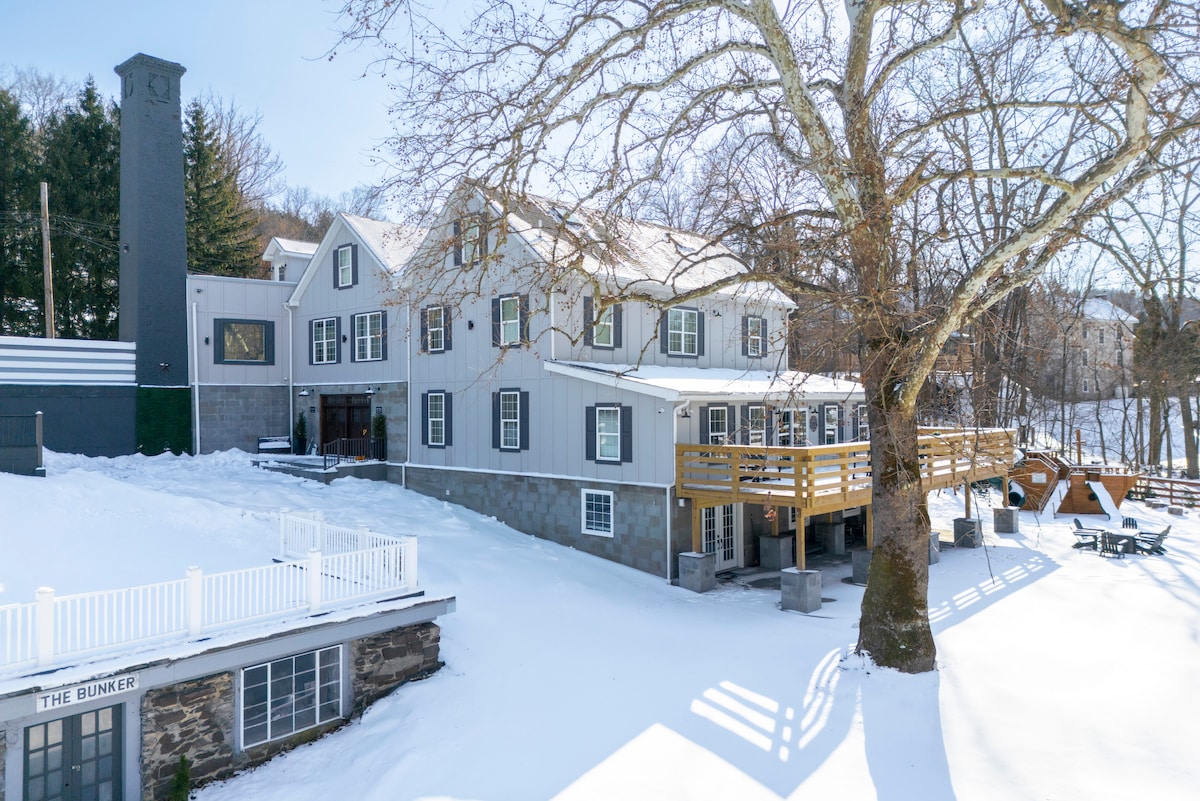 This authentic 1700s farmhouse has 3 bedrooms with a seasonal pool and a wood-fired hot tub on a bucolic 13-acre property. Minutes away from Van Sant Airport, Lake Nockamixon, and the Delaware Canal, this charmingly rustic home has modern amenities, central AC, barn door kitchen cabinets, and a large stone fireplace equipped with a wood burning stove. The property is perfect for small groups of friends and family who enjoy peaceful country life. The house sleeps 5 people and is dog-friendly.