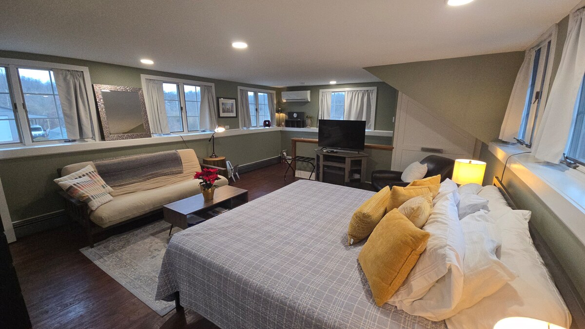 Private second floor space with dramatic views. Kitchenette recently added with new fixtures. Close to small quaint towns and across the street from Ringing Rocks Park. Property abuts the Deleware Canal and River. There is direct acess to the canal and acess (short walk) to river where rhere is acess for swimming. Plenty or outdoor activities to do such as biking, hiking and kayaking or, just enjoy the gardens while sipping wine!