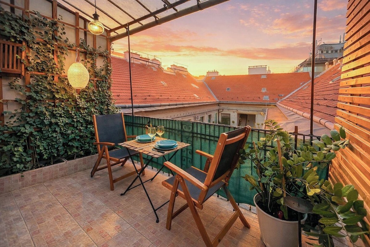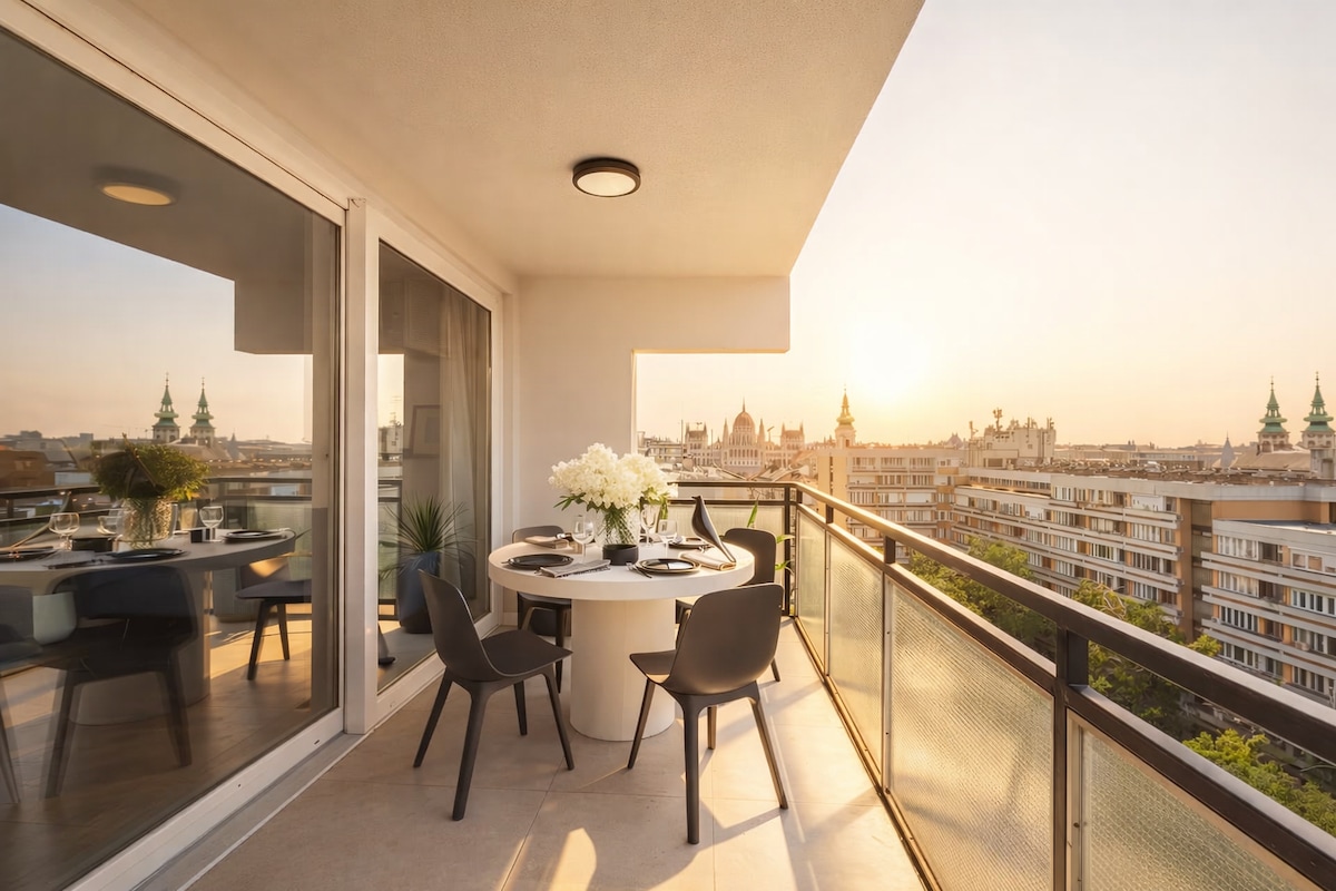 ✨ Stunning top-floor haven in Budapest's heart - perfect for couples, families, or groups up to 4! Features a 4-meter balcony with dining set and sun lounger, offering panoramic views from Buda Castle to MÜPA. Modern luxury meets prime location near VIKING CRUISE dock and Gellért Bath. Fully equipped with queen-size bed and sofa bed. 🌟
