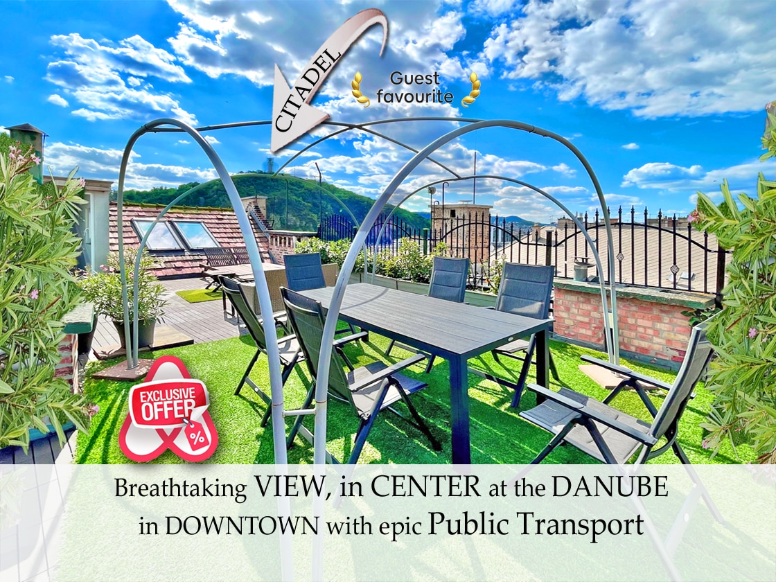 ✨ Stunning top-floor haven in Budapest's heart - perfect for couples, families, or groups up to 4! Features a 4-meter balcony with dining set and sun lounger, offering panoramic views from Buda Castle to MÜPA. Modern luxury meets prime location near VIKING CRUISE dock and Gellért Bath. Fully equipped with queen-size bed and sofa bed. 🌟