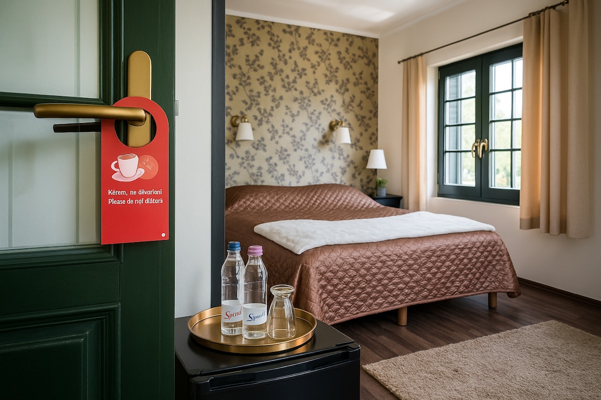 We offer a cozy suite for two guests on the upper floor of the Vakvarjú Csónakház restaurant. The room features a private bathroom with shower, a small entrance area, TV, nightstand, and wardrobe. It is air-conditioned in summer and heated in winter. Thanks to its upstairs location, guests can enjoy a beautiful view of the picturesque Danube riverside.