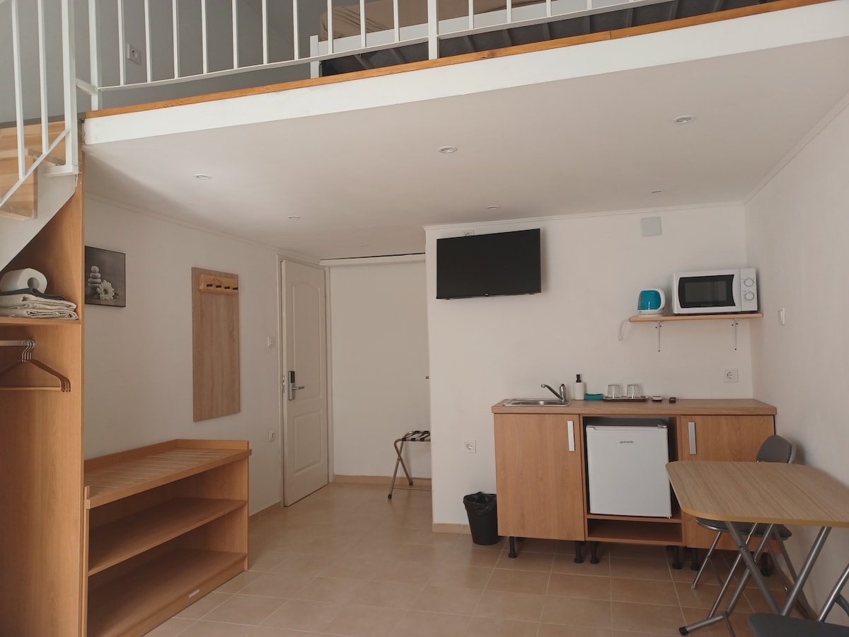 We offer a cozy suite for two guests on the upper floor of the Vakvarjú Csónakház restaurant. The room features a private bathroom with shower, a small entrance area, TV, nightstand, and wardrobe. It is air-conditioned in summer and heated in winter. Thanks to its upstairs location, guests can enjoy a beautiful view of the picturesque Danube riverside.