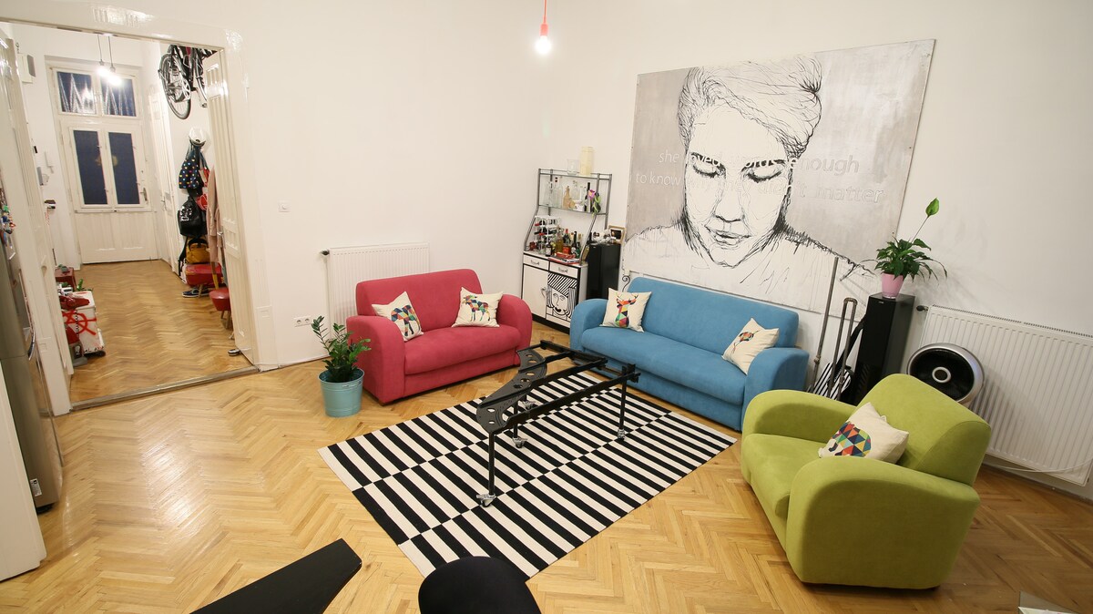 Have you ever dreamed about an artist's extravagant studio? Feel the vibe and try a famous Hungarian painter Lajos Vajda's renewed studio loft, facing the city biggest park Városliget. Park for free in our underground garage and cook in our kitchen with striking wood cabinets and exposed brick. A factory-chic chandelier hangs above a modern dining table while a living area basks in natural light from industrial windows. Beautifully designed in 100 -years-old house, near to Heroes square.