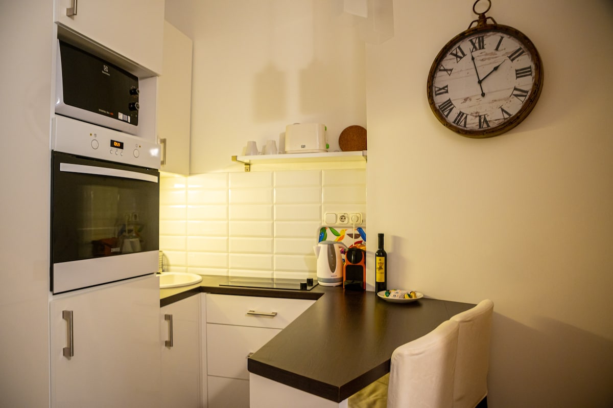 The accommodation includes one bed room with queen size bed, and a very spacy living room with open kitchen and dinning table. The bathroom is large and pampering. The flat is full with light, is airy and has a great atmosphere. You will have a high-speed WI-FI in the flat and also LAN connection. The entire flat is offered for use including Nespreso coffee-maker, oven, fridge and micro. We offer our guests to enjoy our organic hand made soaps. You will have a high-speed WI-FI in the flat and also LAN connection. The entire flat is offered for use including Nespreso coffee-maker, oven, fridge and micro. The flat is located in the fifth district, in the heart of downtown Budapest. The neighborhood is lively and restaurants, cafes, and ruin bars are all around. The street is very close to the famous Dohany synagogue and Vaci shopping street. Getting around couldn't be easier from this flat. You can either walk around to the famous city center highlights or use any of the excellent public transportation; bus, metro or tram. The flat is 50-200 meters distance from bus, tram and metro stations. The flat is located in the second floor of an historical building that was designed by the same famous architect of the opera house. The flat is modern but the building is not renovated and has NO LIFT, similar to many of Budapest's downtown buildings that bring together past and present, old and new.