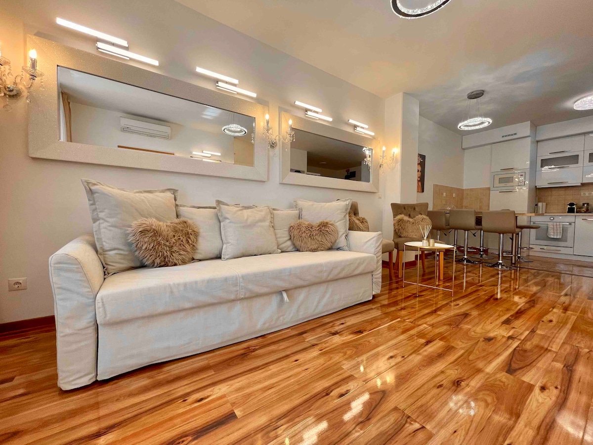 Danube Panorama & Luxury: 78 m² Apt + Free Garage 8th floor: 78 m² apartment, huge 65 m² glass living room, 14 m² terrace. Safety: 24/7 Professional Security & Guard Service. Garage: Free underground parking with direct elevator access to the unit. Location: Bakery & cafés in the building, ATM right next to it. Extras: Fan-coil cooling & heating, large Smart TV with Netflix, washing machine. Ultimate comfort with the city's best panoramic view!