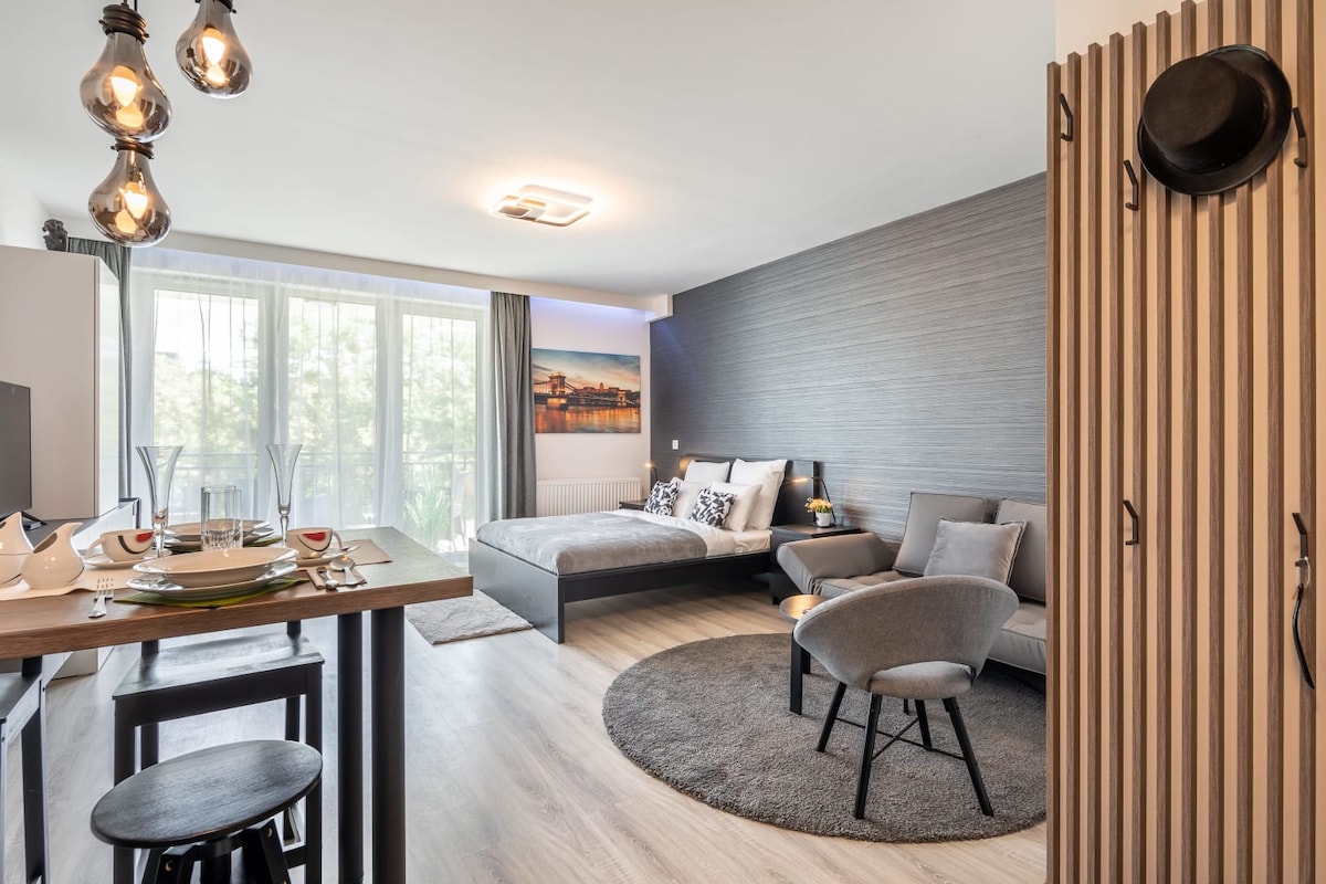 Welcome to this newly built, cozy apartment at great central location! The place is a perfect choice for couples or families up to 3 guests. This one-room apartment is fully equipped and has everything you need for a relaxing stay. We offer our guests free parking in the garage of the building. Despite the quietness of the street, it is a vivid neighbourhood near the Heroes' Square and many other attractions.