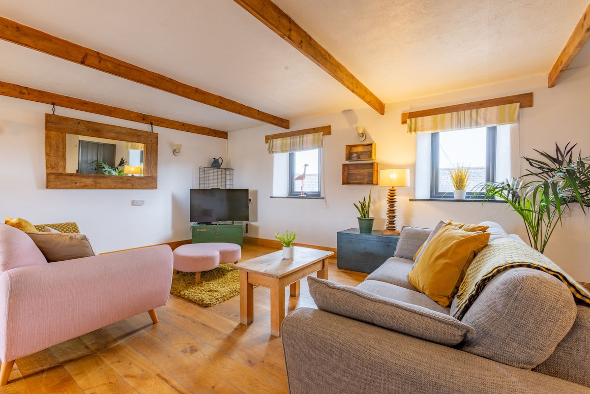 This quaint detached barn is full of character and peace (no WIFI). There is an open plan kitchen/living area with a cosy log burner ( logs available at £7 cash a net) and a slate topped breakfast bar. The property has solid oak flooring throughout except for slate in the bathroom so don’t forget your slippers! The kitchen includes an oven, hob, fridge-freezer, toaster, microwave and kettle. The cosy sitting area opens out onto an attractive patio and grassy area. Sorry no pets
